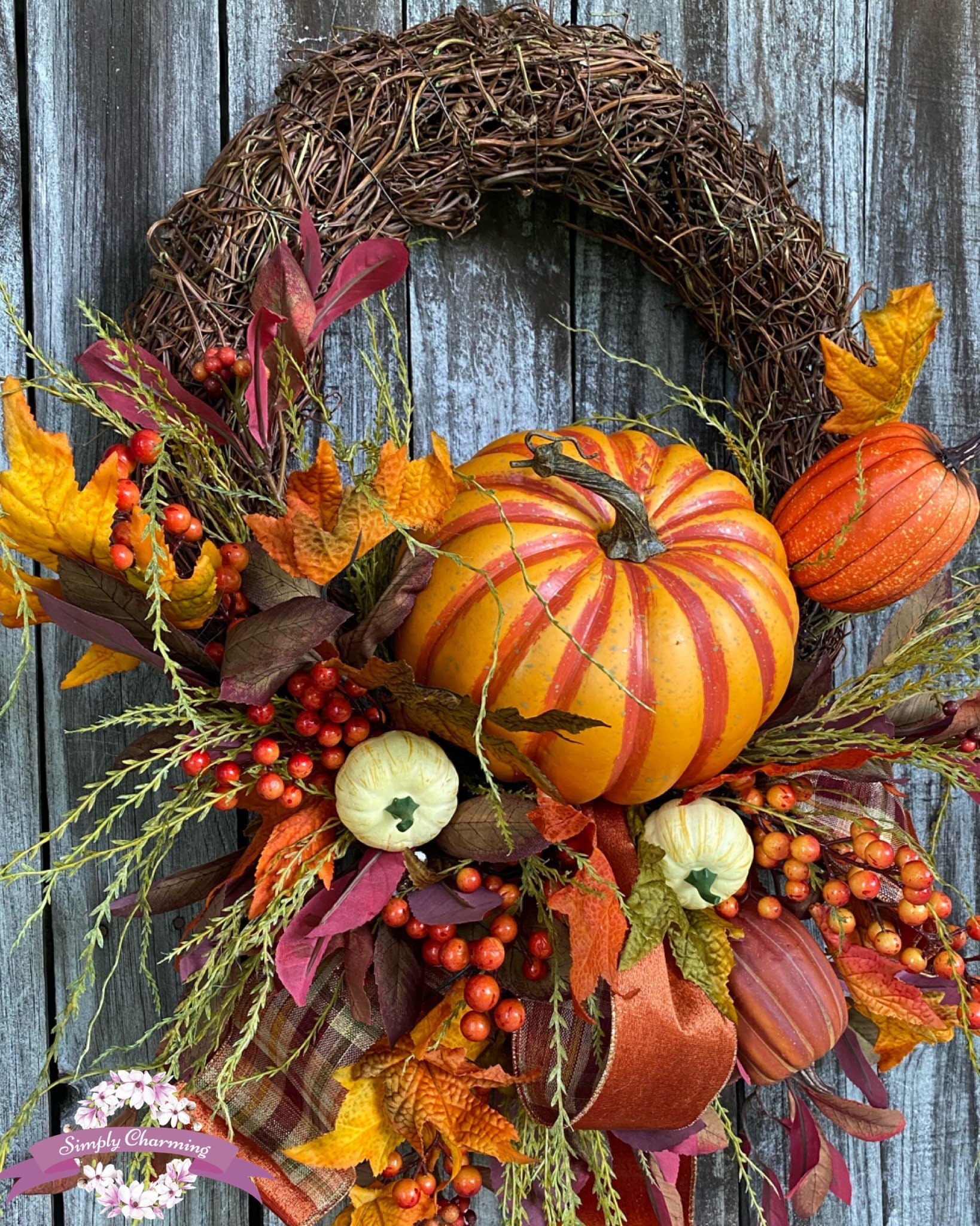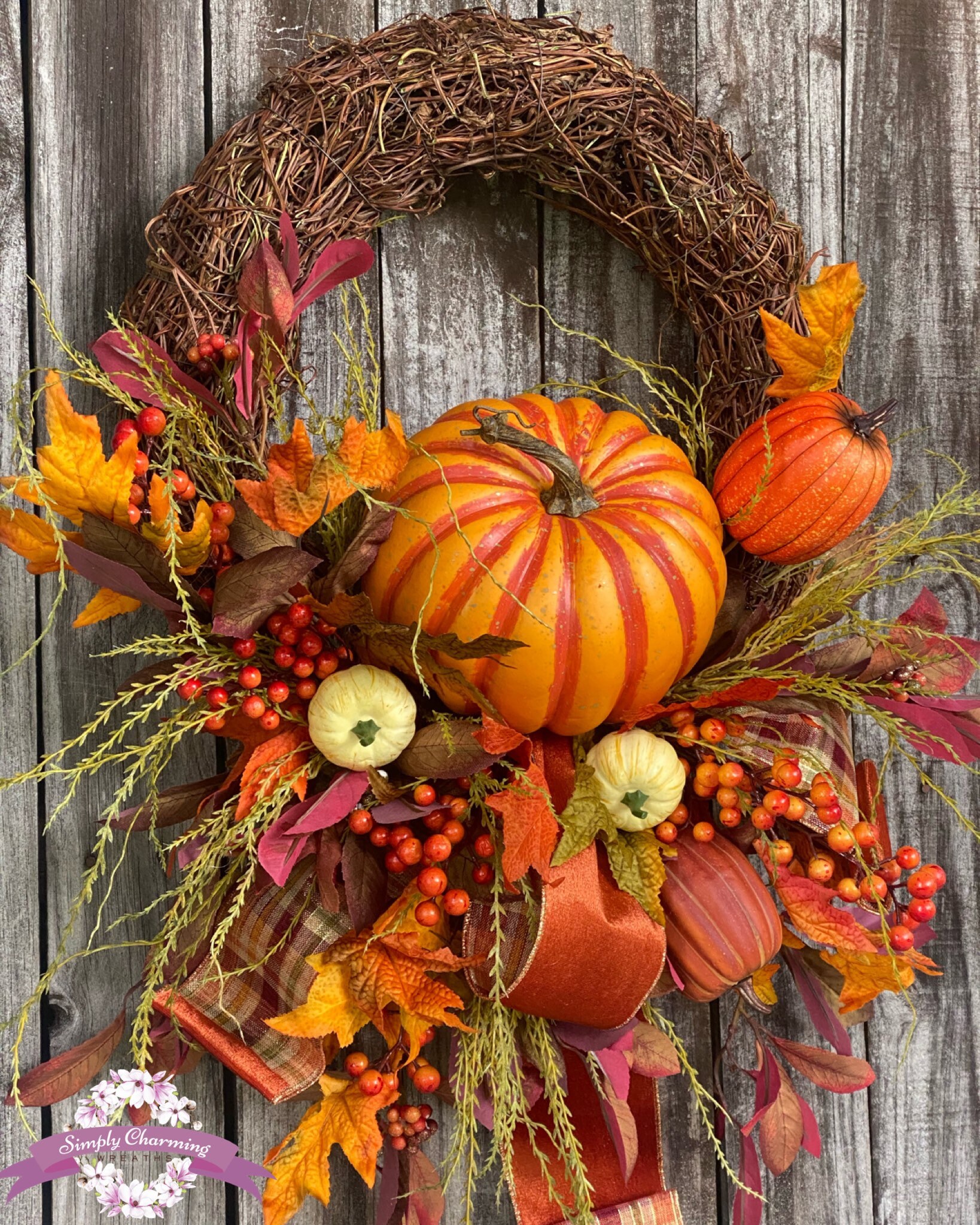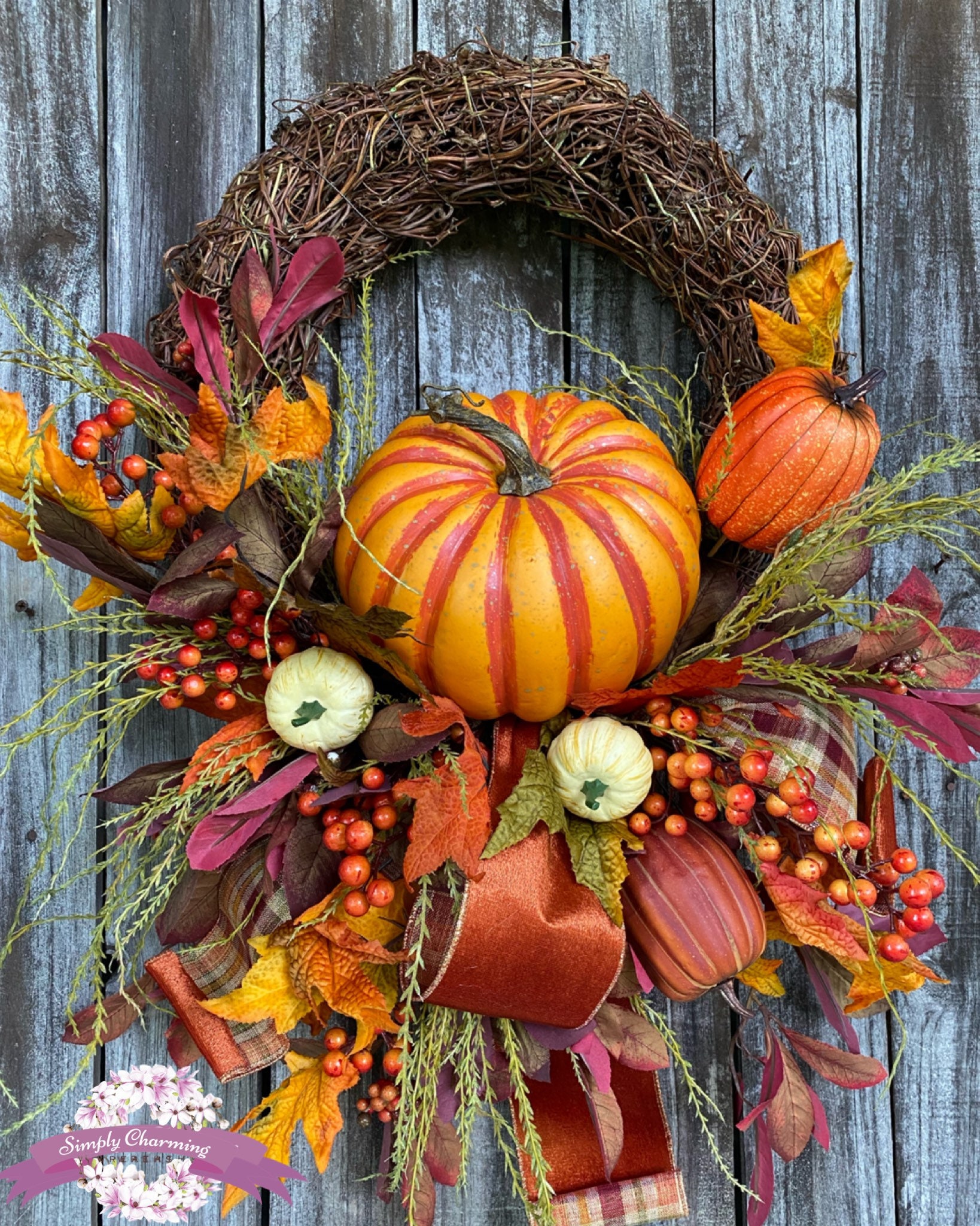 Made on a grapevine base and full of elegant ribbons, pumpkins, Fall florals, greenery~ this beauty is full of style!