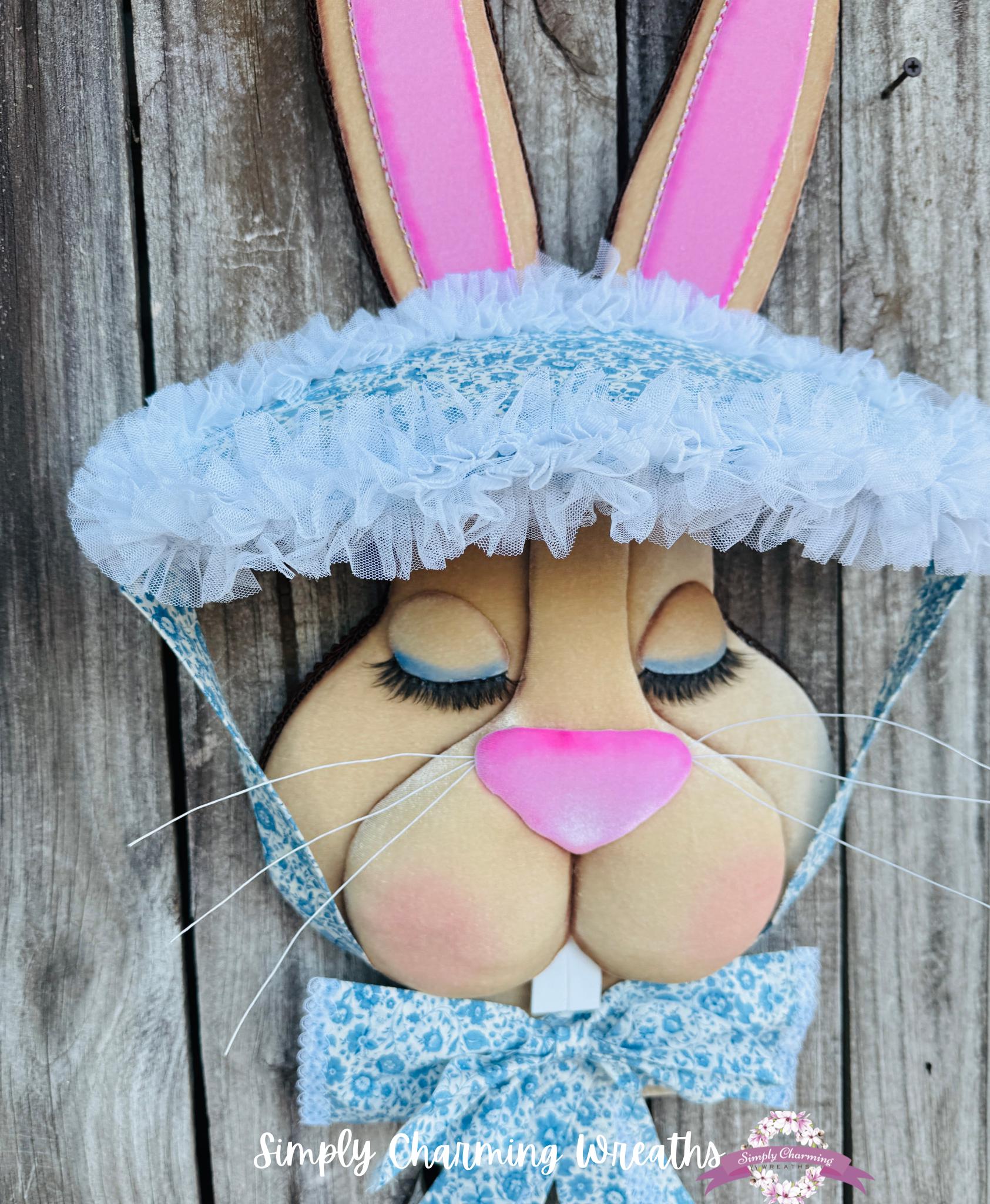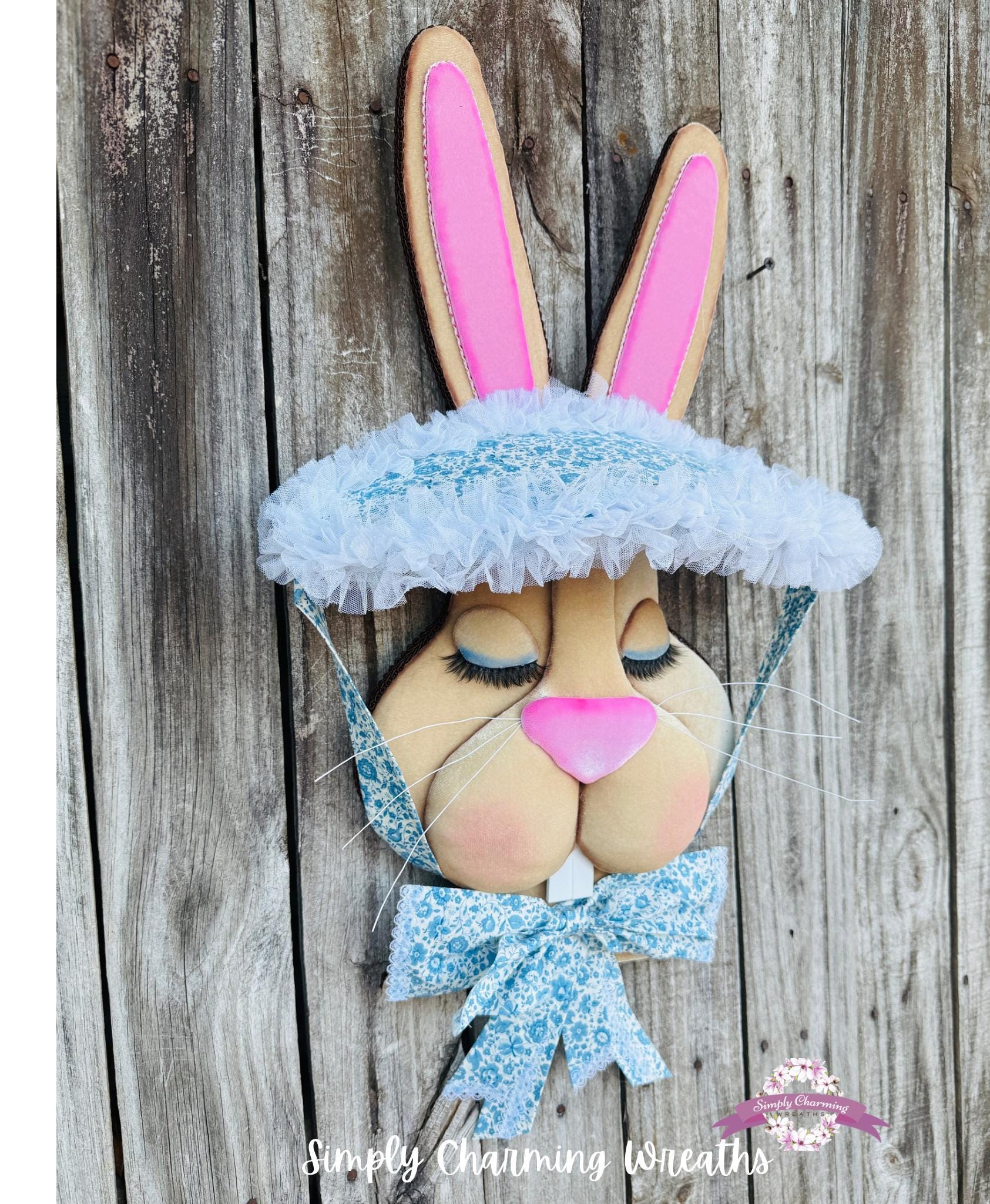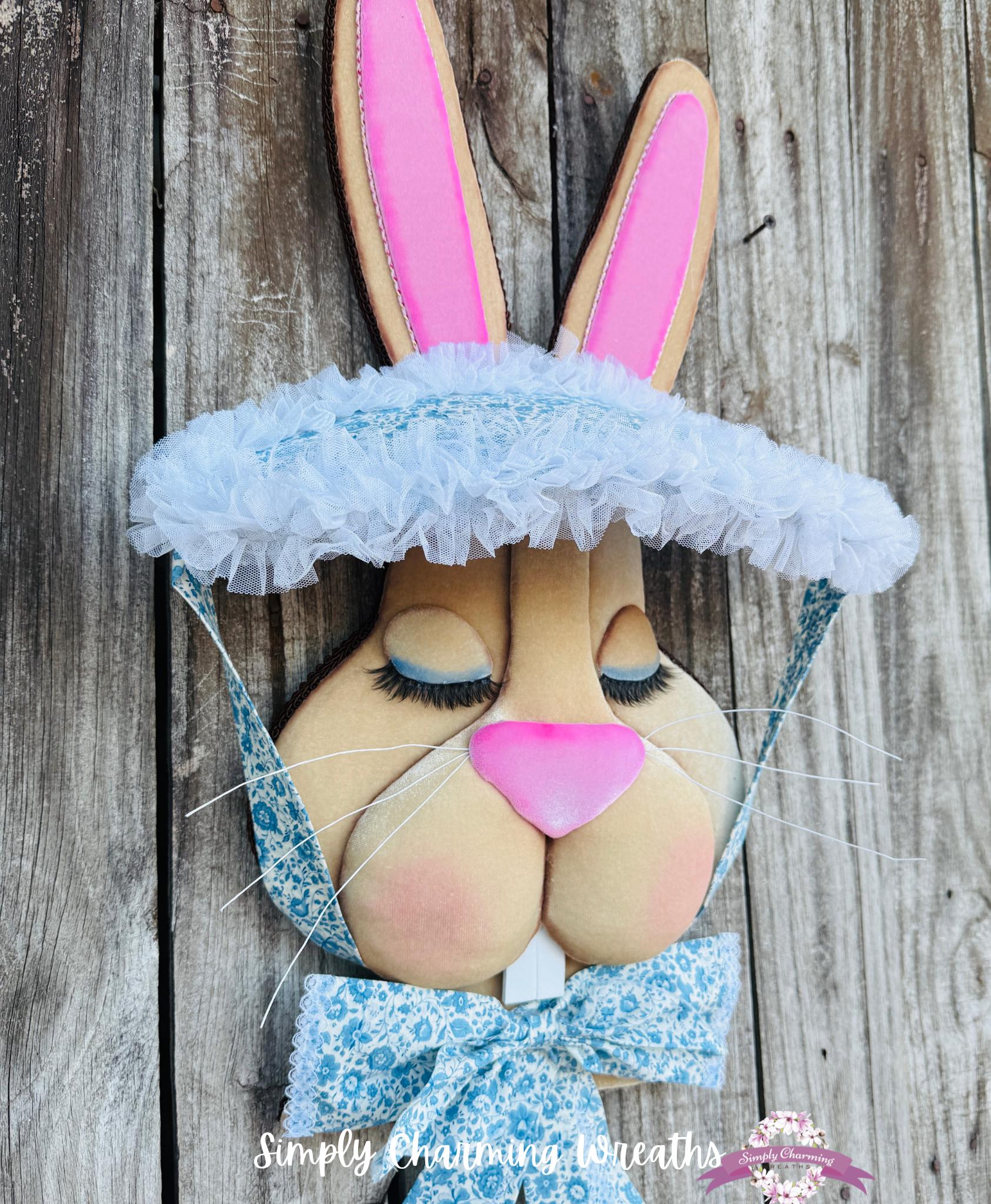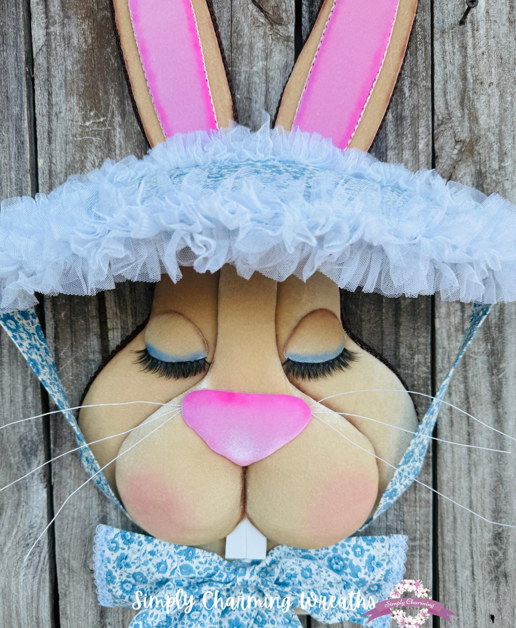 Introducing Tea Time Bonnie, the sweetest Bonnie lass ready to charm your wreath or door! This handmade bunny face (head only) features soft light brown velour fabric, sleepy eyes, pink inner ears and pink nose, delicate whiskers, and rosy cheeks for an irresistibly cute expression.