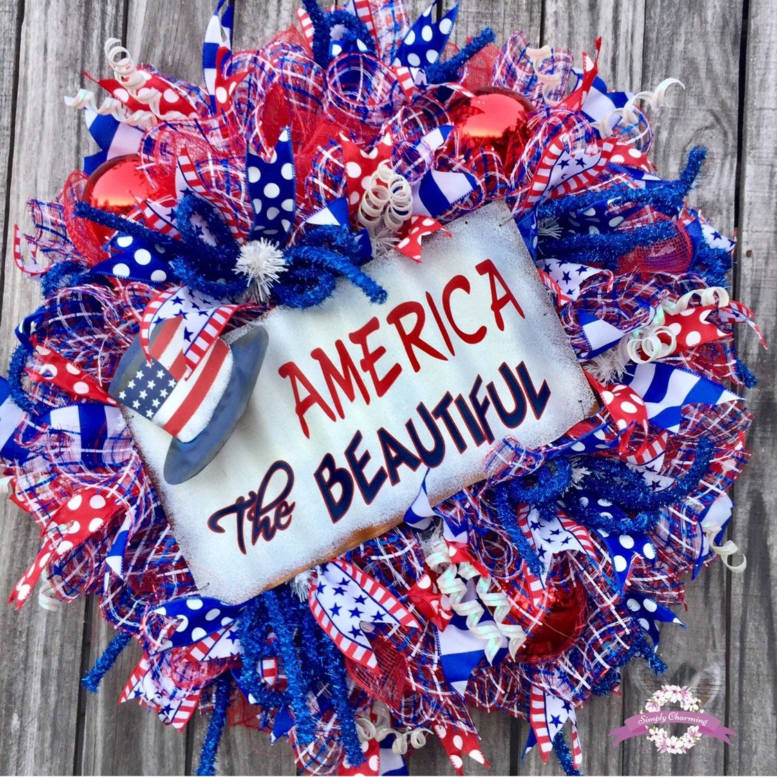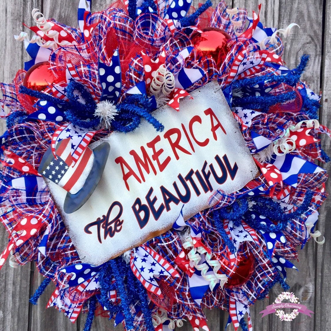 Other elements of this wreath consist of large shiny red ornaments, royal blue tinsel deco flex tubing, iridescent white curly q's and a metal sign that reads America the Beautiful.