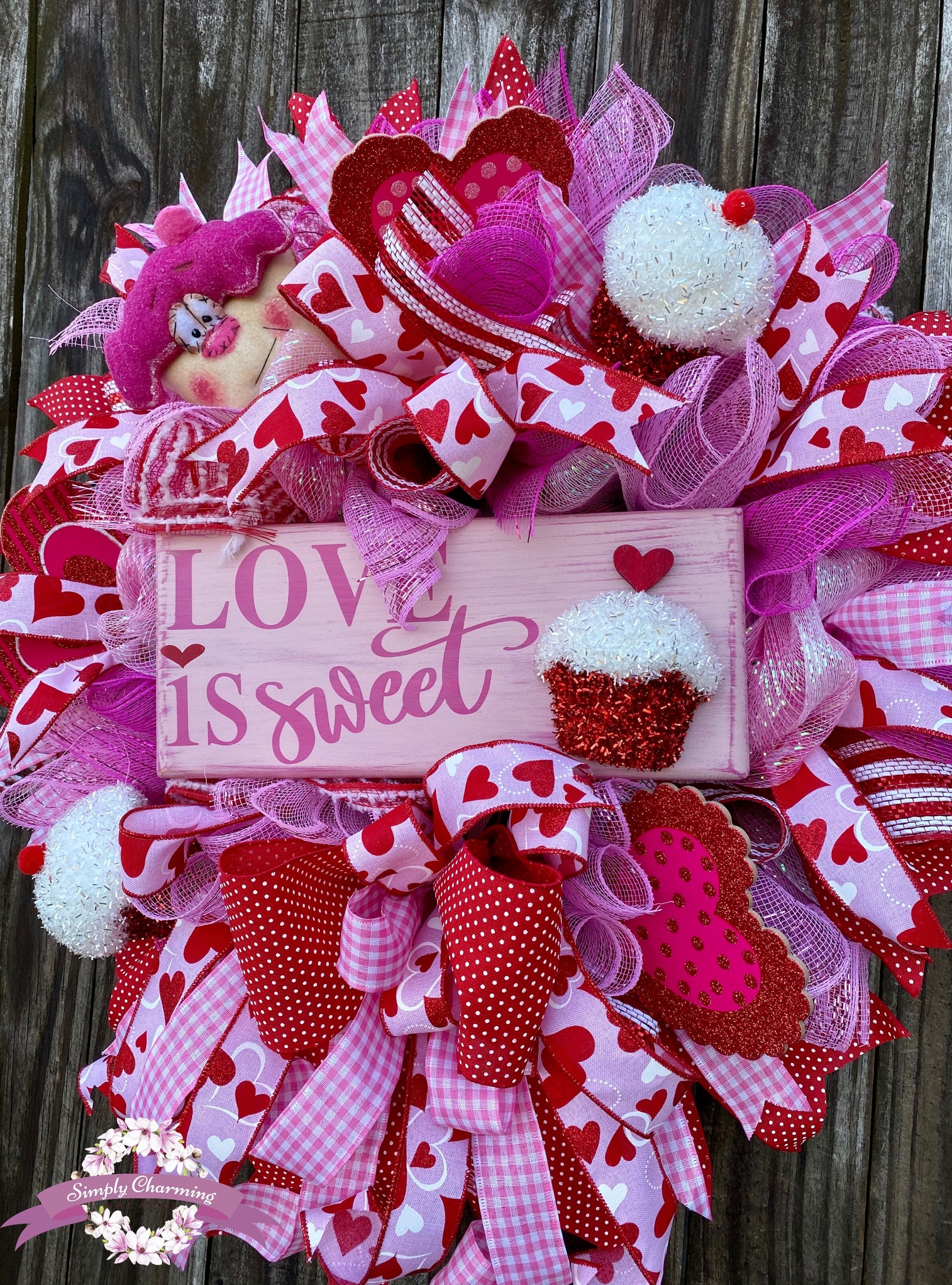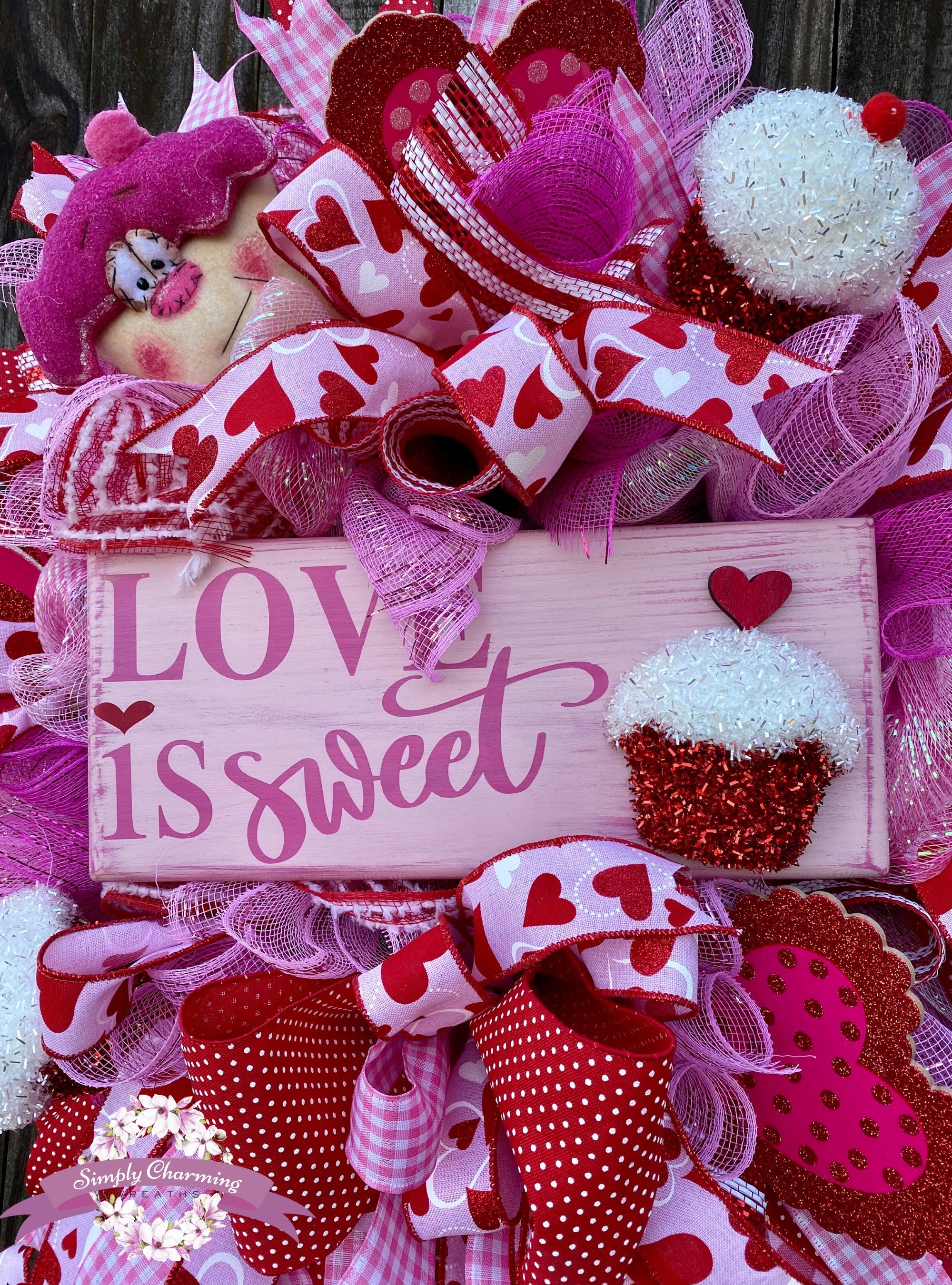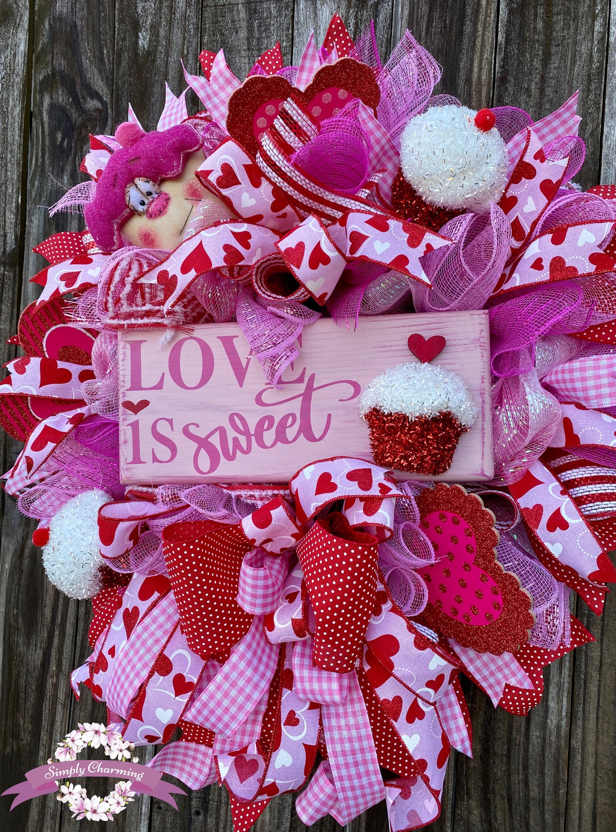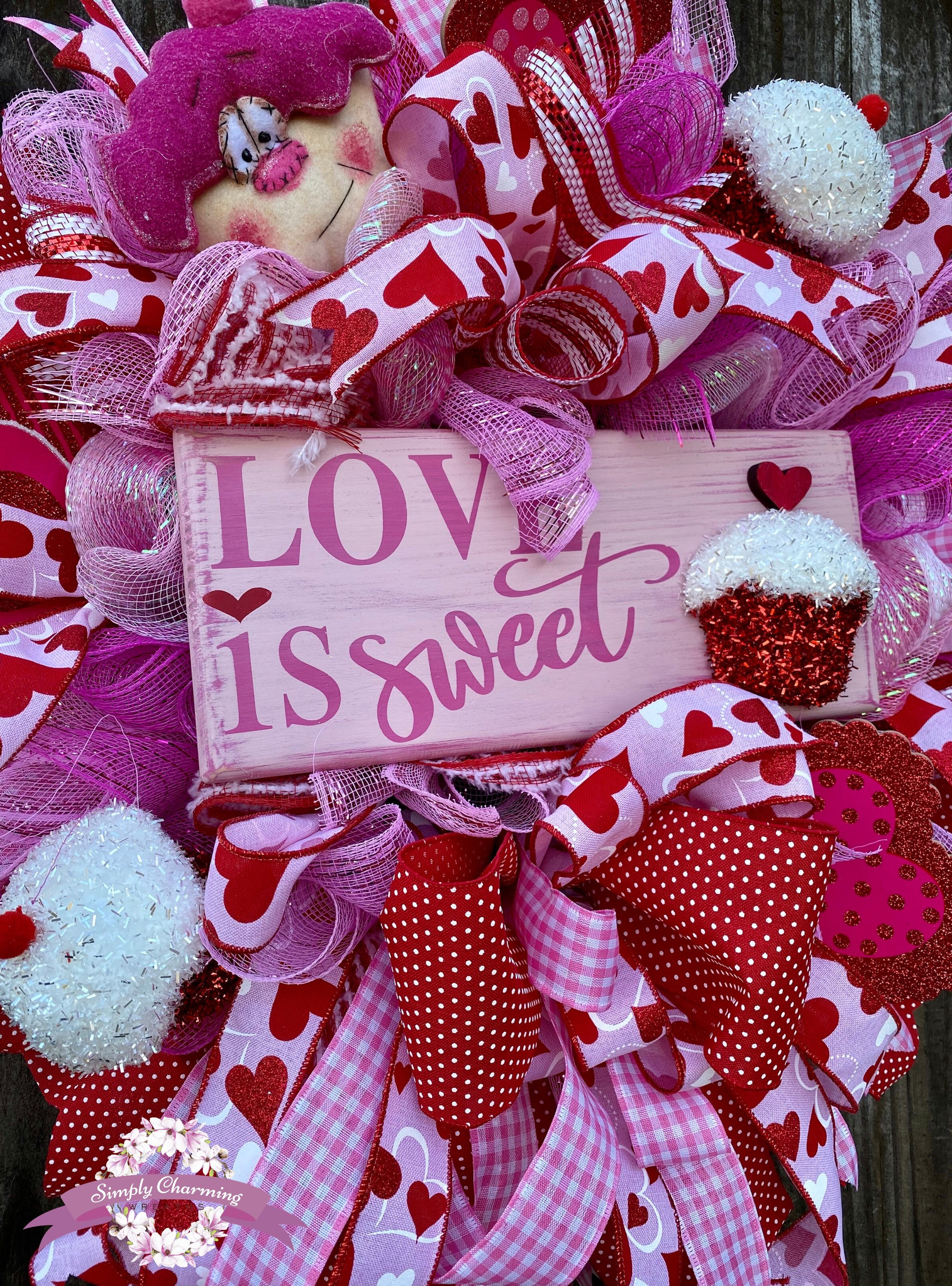 A wooden, hand painted sign with a cup cake and a little red wood heart on top is nestled amongst color coordinating deco mesh and ribbon in multiple patterns and sizes. Several handmade bows are placed throughout also. This wreath is just simply charming đź’—