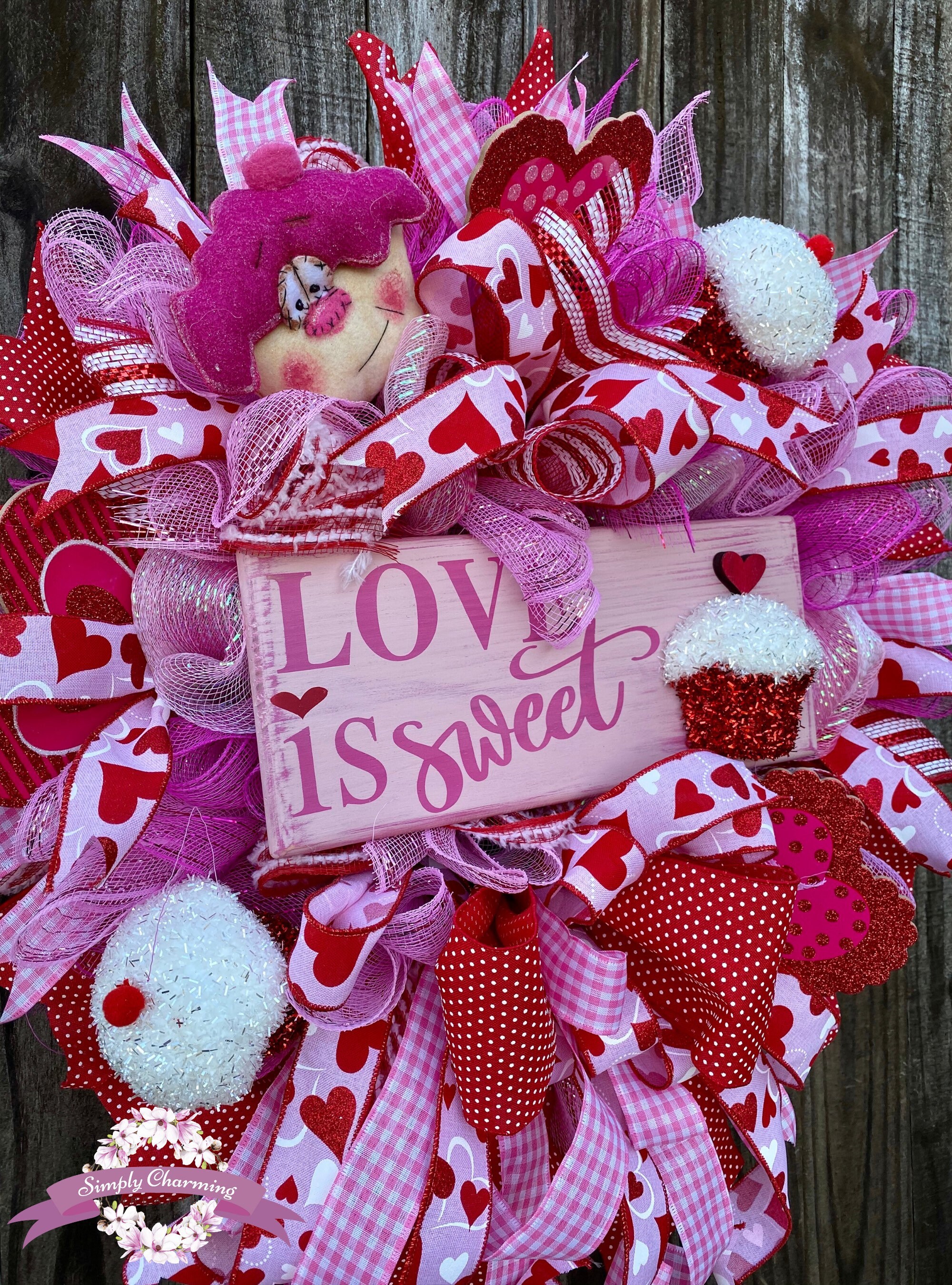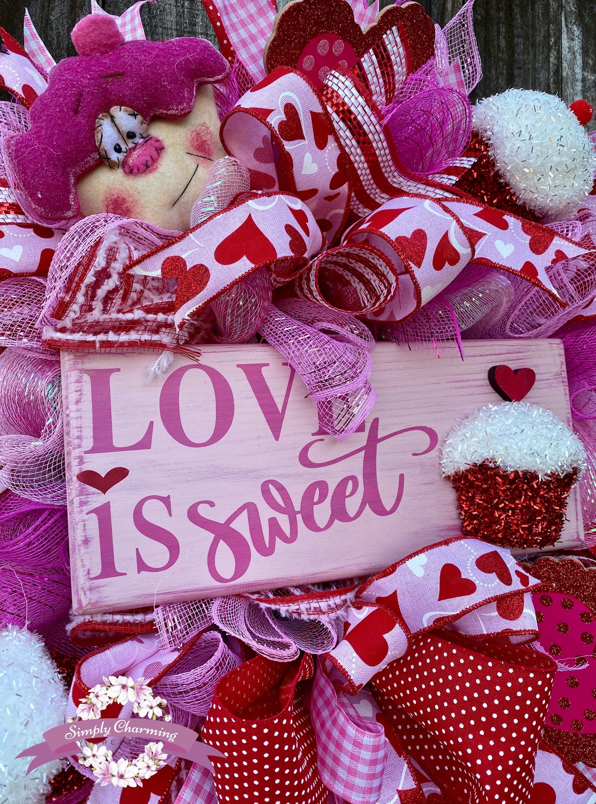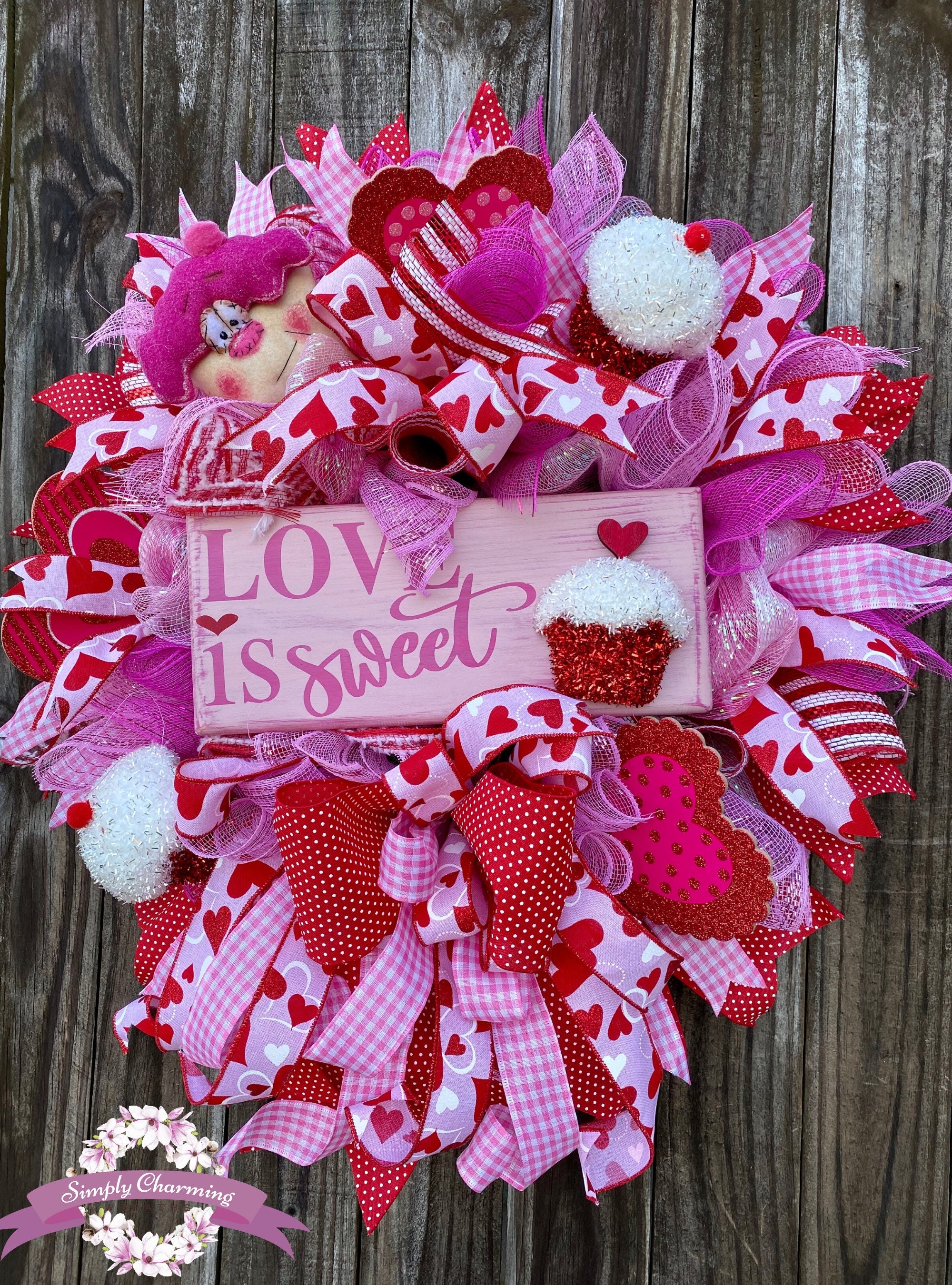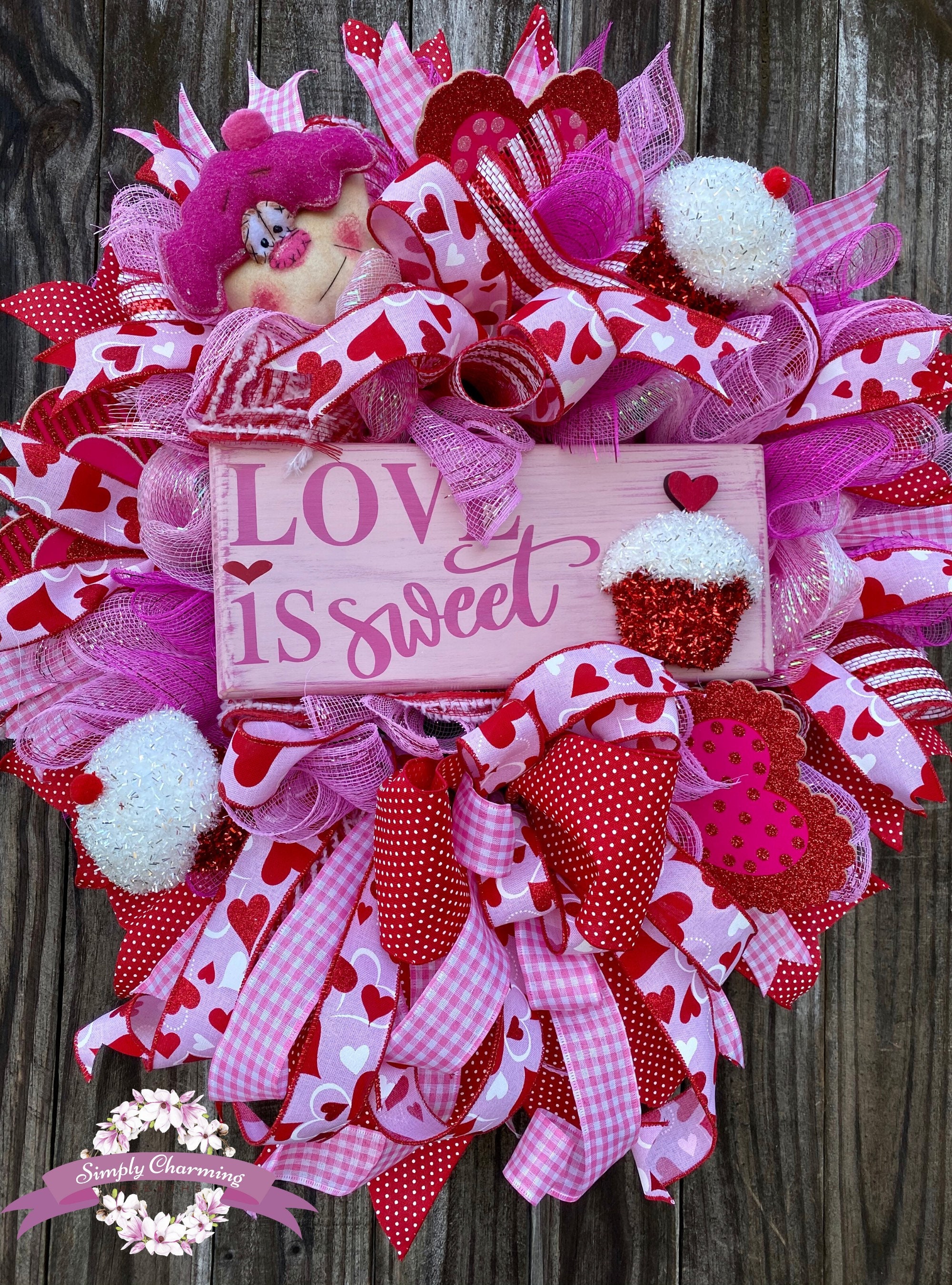 A wooden, hand painted sign with a cup cake and a little red wood heart on top is nestled amongst color coordinating deco mesh and ribbon in multiple patterns and sizes. Several handmade bows are placed throughout also. This wreath is just simply charming đź’—