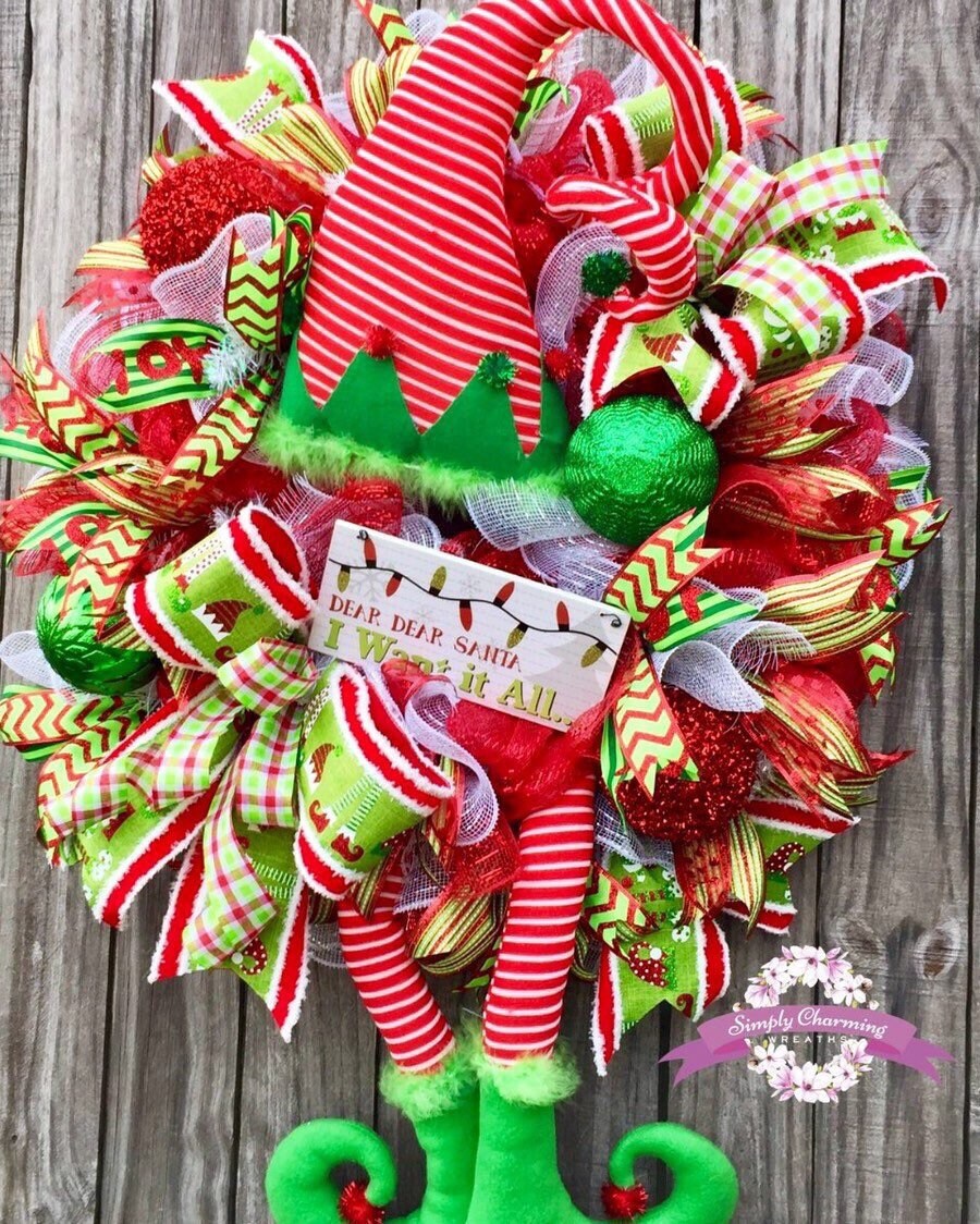 This whimsical elf wreath is designed with deco mesh, ribbon streamers and beautiful handmade bows that are placed throughout in multiple color coordinating ribbon patterns and sizes. Accented with red and green shatter proof ornaments in varies sizes and patterns and the main attraction is a adorable Elf hat and legs in red and green. Also a sign in matching colors of red and green was added with the saying " Dear Santa I want it all " It adds just the right playful touch to bring back childhood memories and bring a smile to your face.