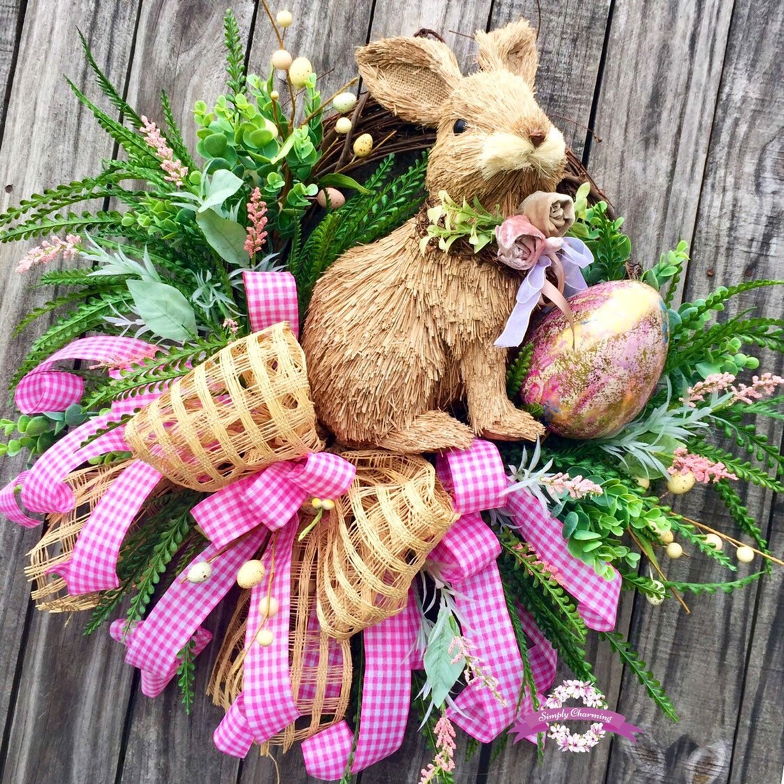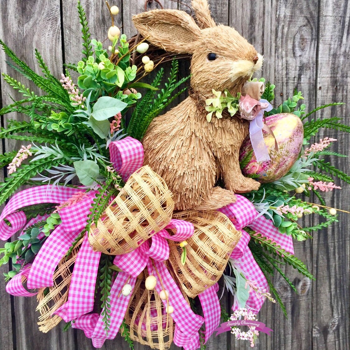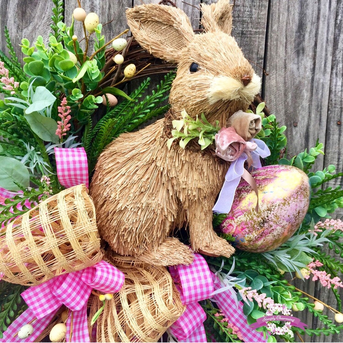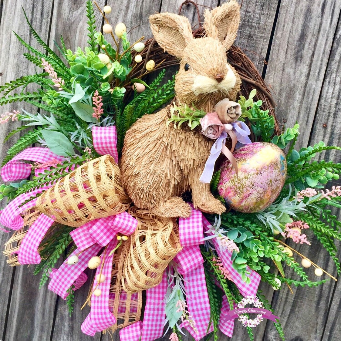 💐Description: Made on a grapevine base with lush vibrant grasses in dark and light greens, dainty pink flowers , multiple sizes and colored Easter eggs and the sweetest little bunny sits snuggly in the center nestled among all the spring fun. A big beautiful burlap windowpane and pink gingham bow adds a touch of softness and gives the wreath just the right touch of charm and detail to make this wreath Spectacular!
