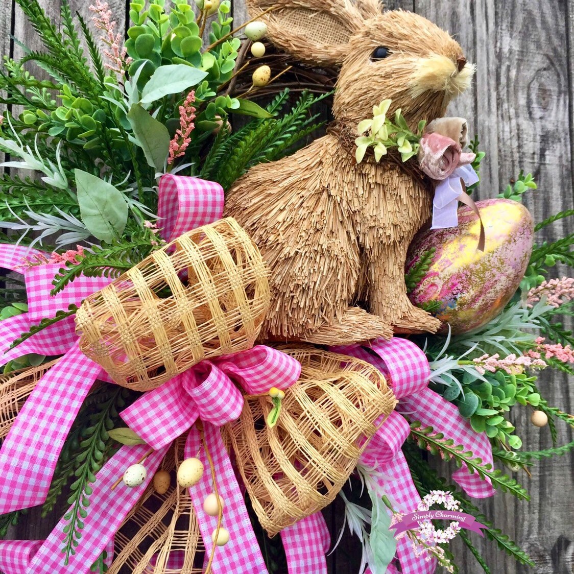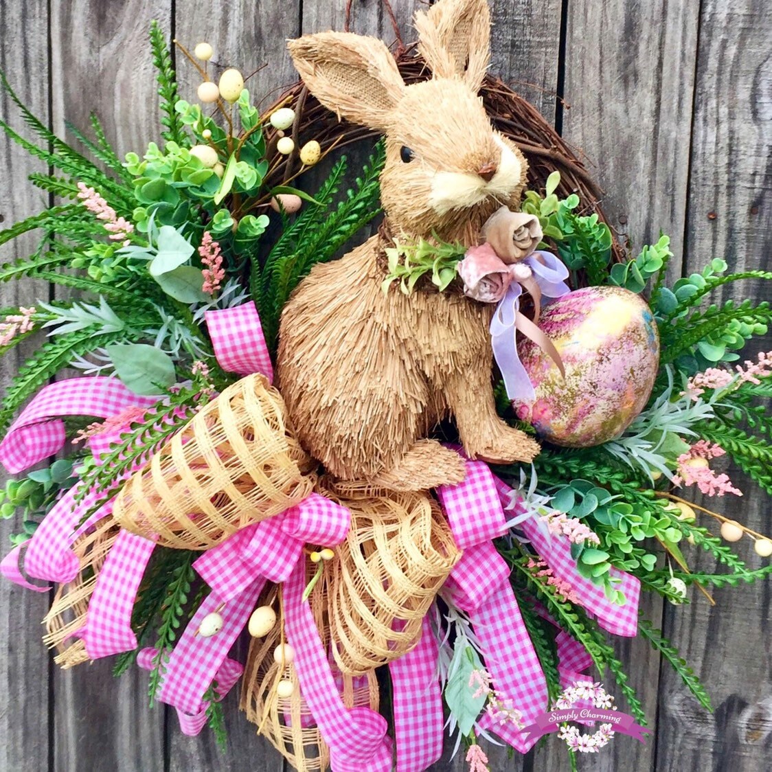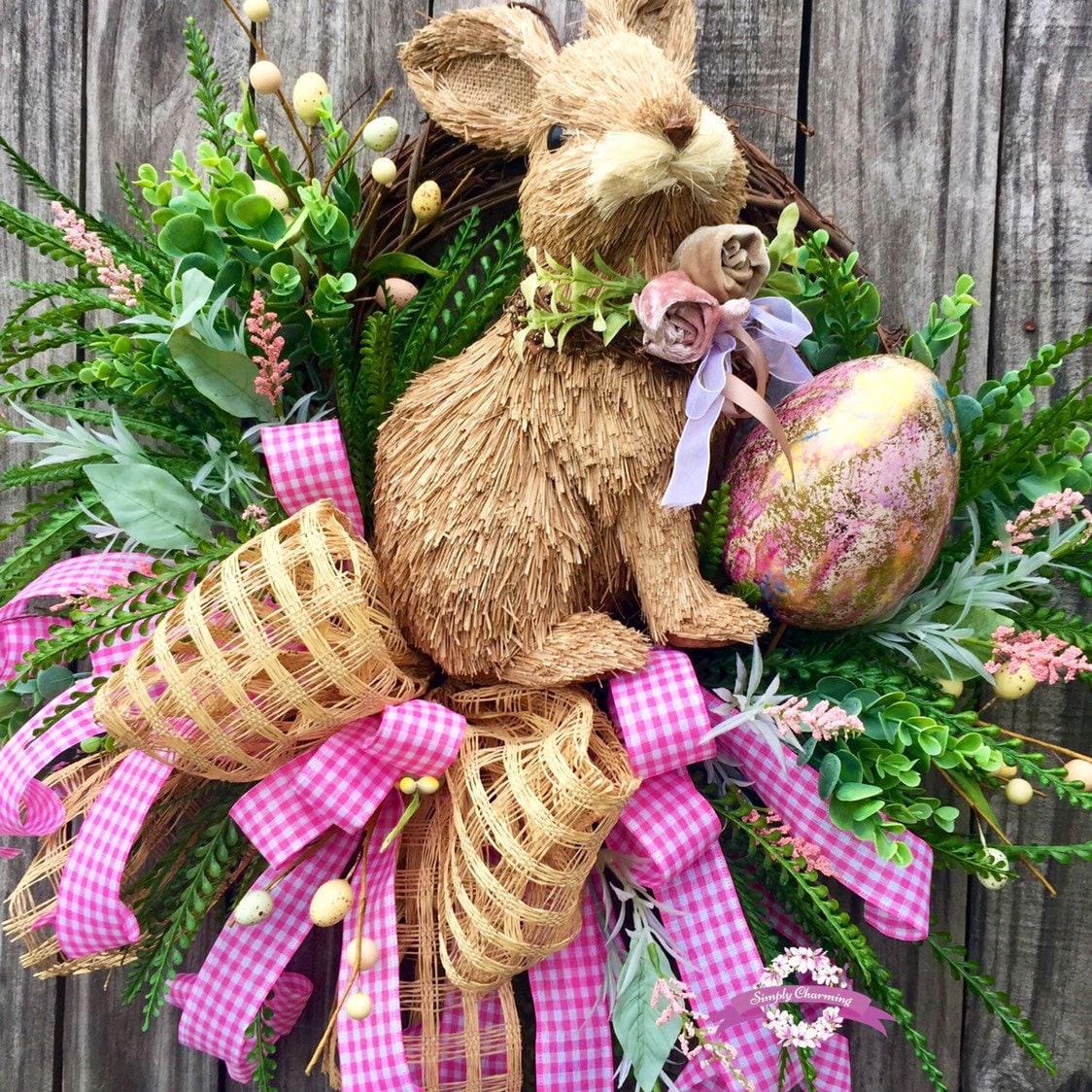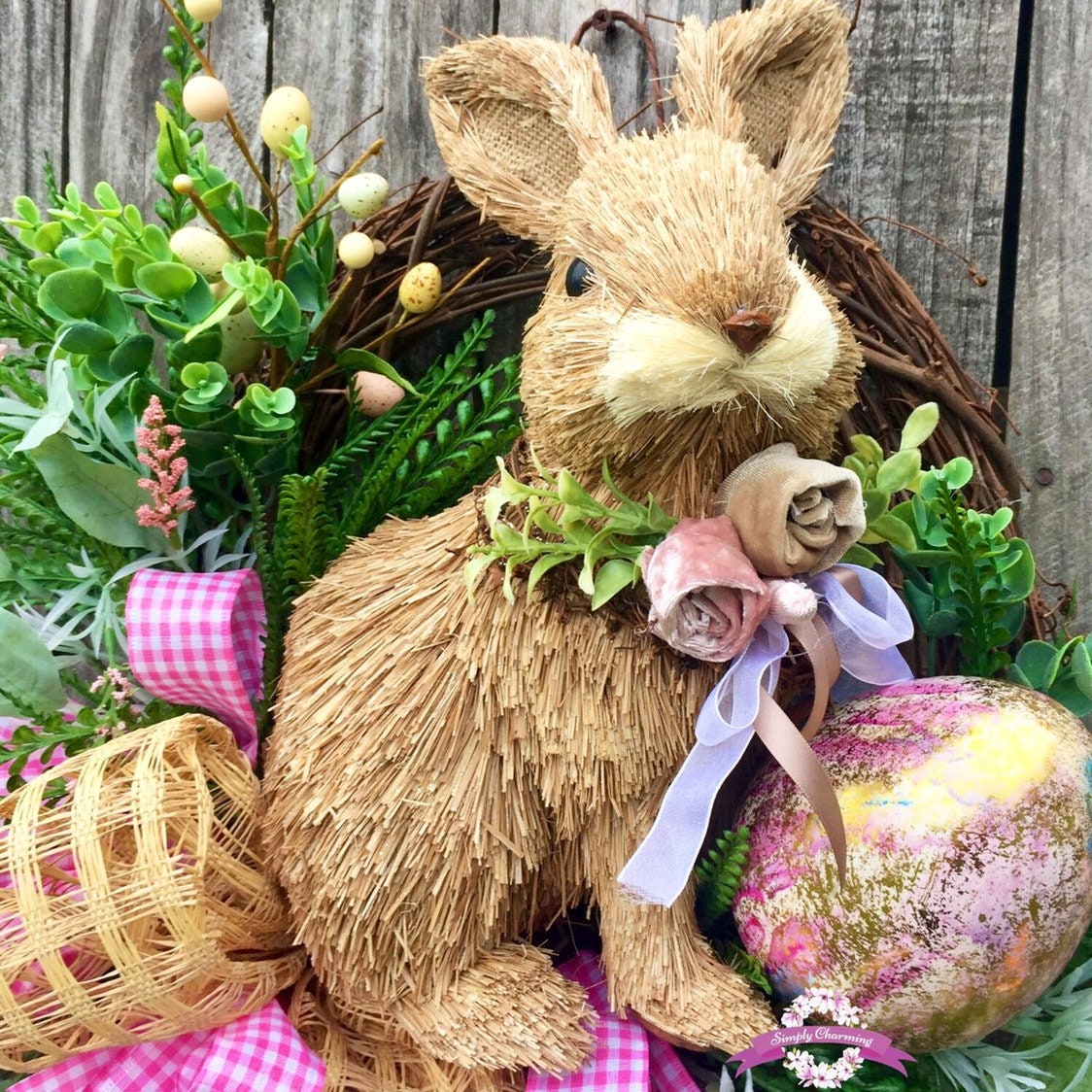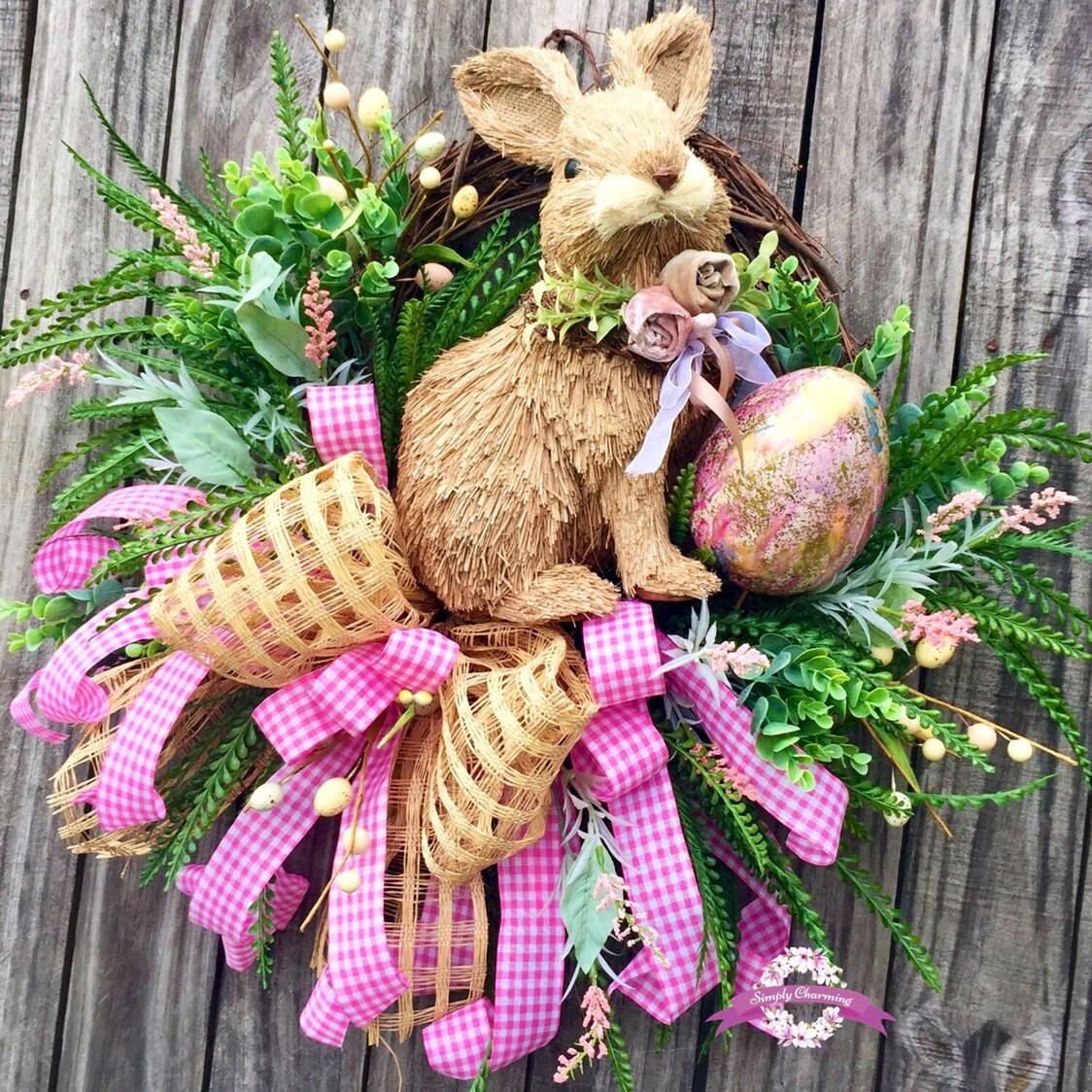 💐Description: Made on a grapevine base with lush vibrant grasses in dark and light greens, dainty pink flowers , multiple sizes and colored Easter eggs and the sweetest little bunny sits snuggly in the center nestled among all the spring fun. A big beautiful burlap windowpane and pink gingham bow adds a touch of softness and gives the wreath just the right touch of charm and detail to make this wreath Spectacular!