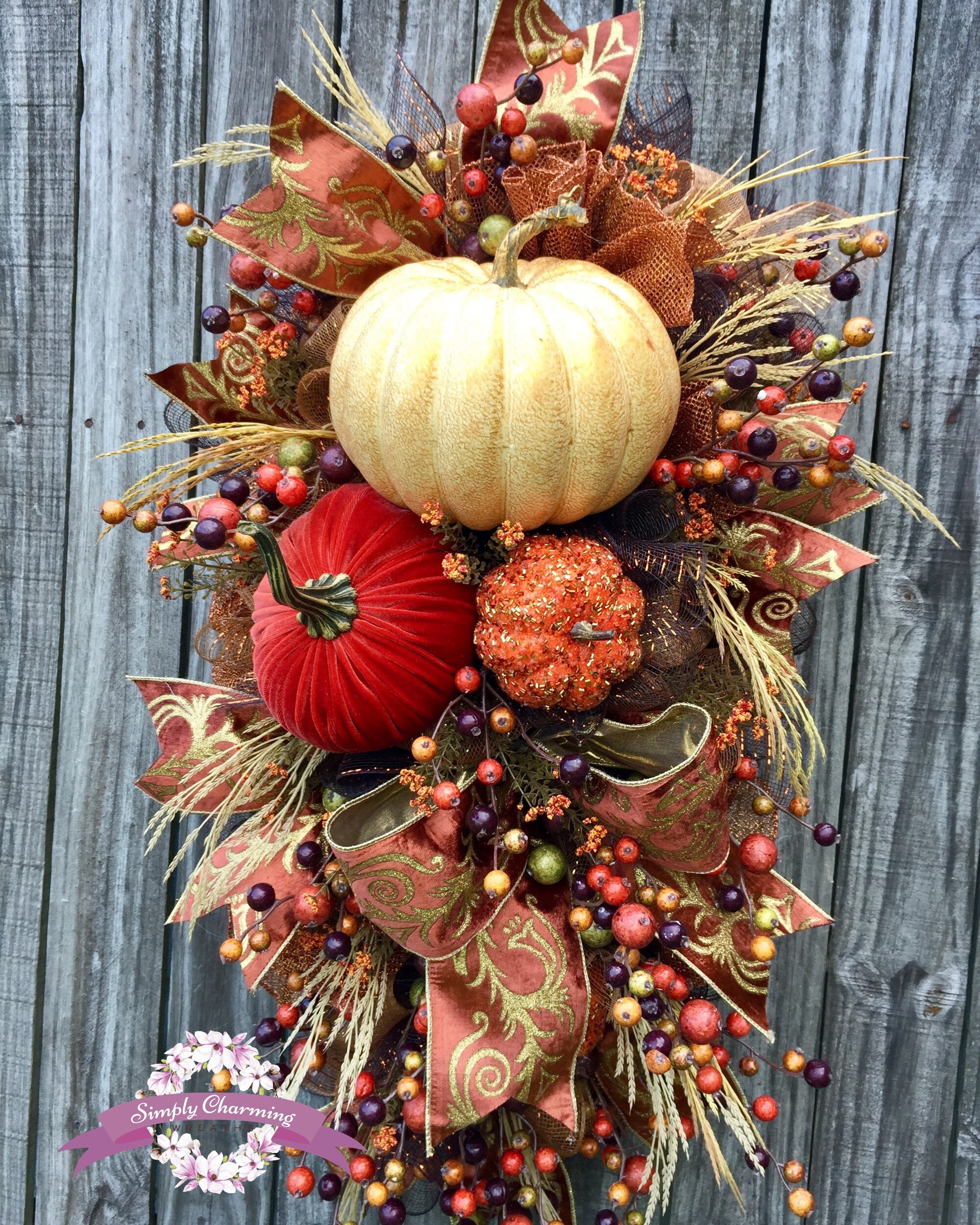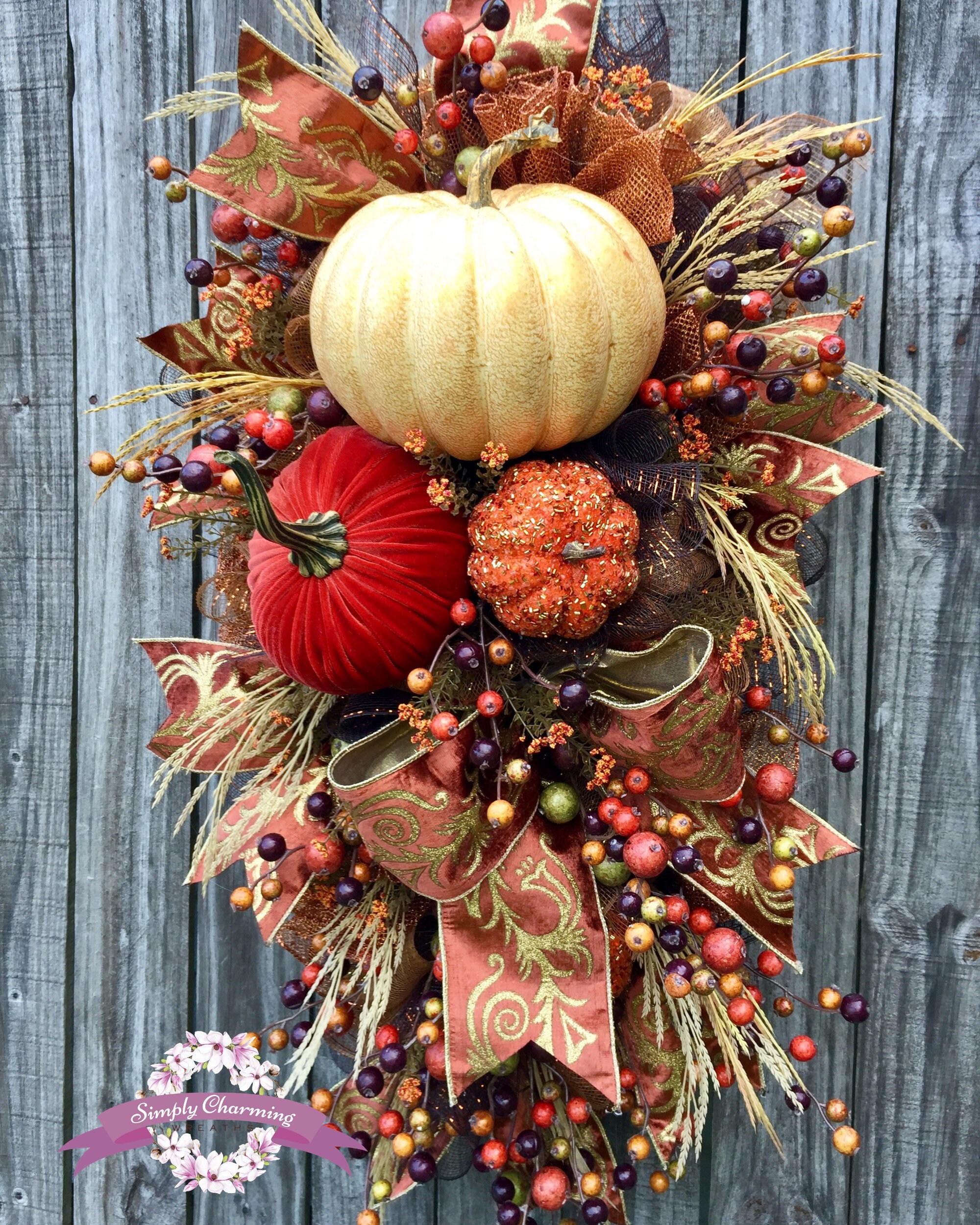 Made on a evergreen base and filled with mesh and beautiful top quality designer ribbon in velvet orange and gold. A large cream / gold pumpkin sits front and center surrounded by a velvet orange pumpkin, orange sequined pumpkins, beautiful fall berries, harvest wheat and fall rust/ orange colored budding greenery, Talk about elegance and style - WOW this fall swag has got it and its all in the details. This swag will defiantly be a head turner and guaranteed to get your door noticed this fall season!