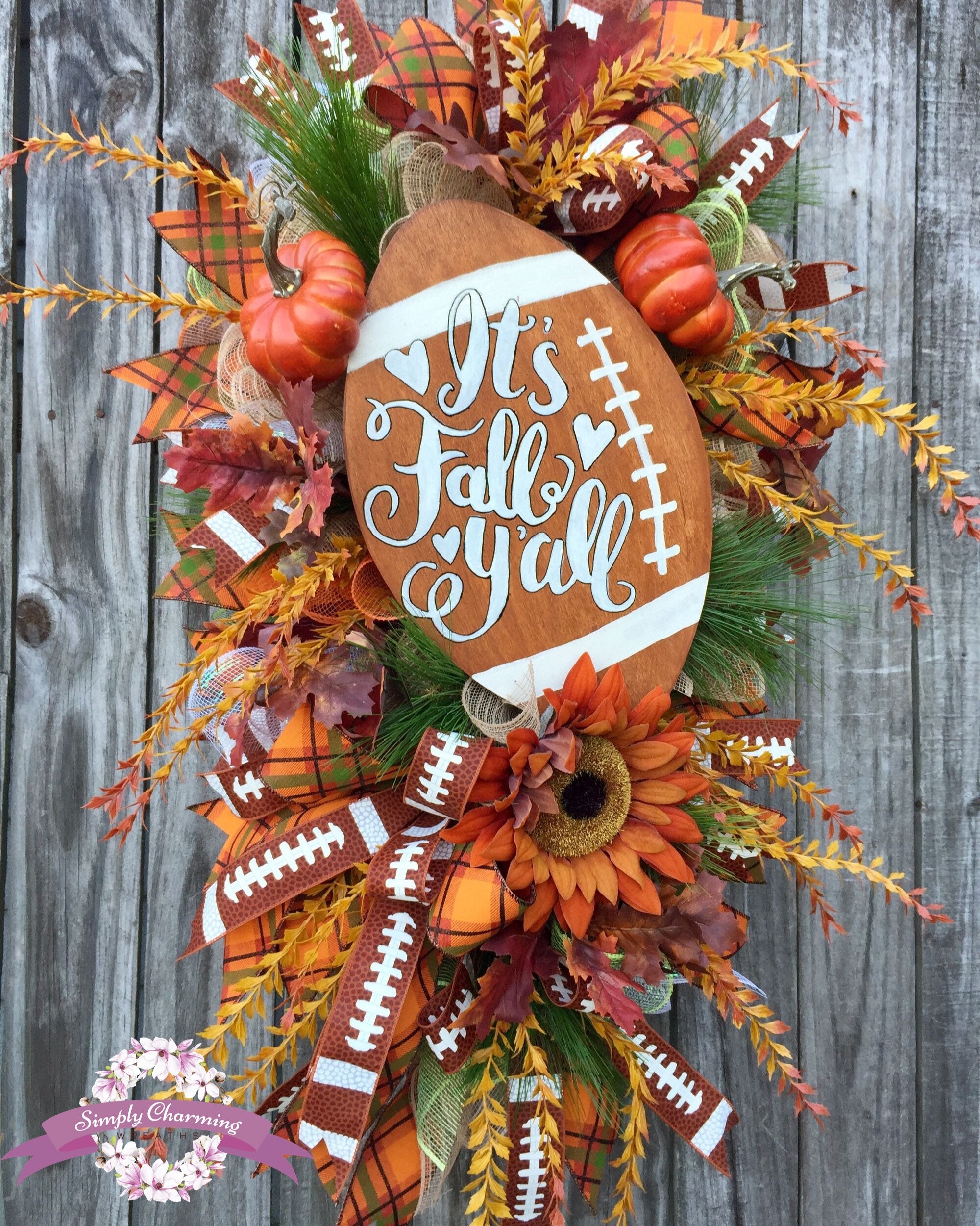 Designed on a swag pine base. Layered in burlap mesh and accented with beautiful ribbons and bows.Surrounded by pumpkins, a large beautiful sunflower,fall leaves and greenery. All the details accent a wood football sign with reads "It's Fall Ya'll". This swag is perfect for the football loving family and its a big beauty that makes a fun fall statement.