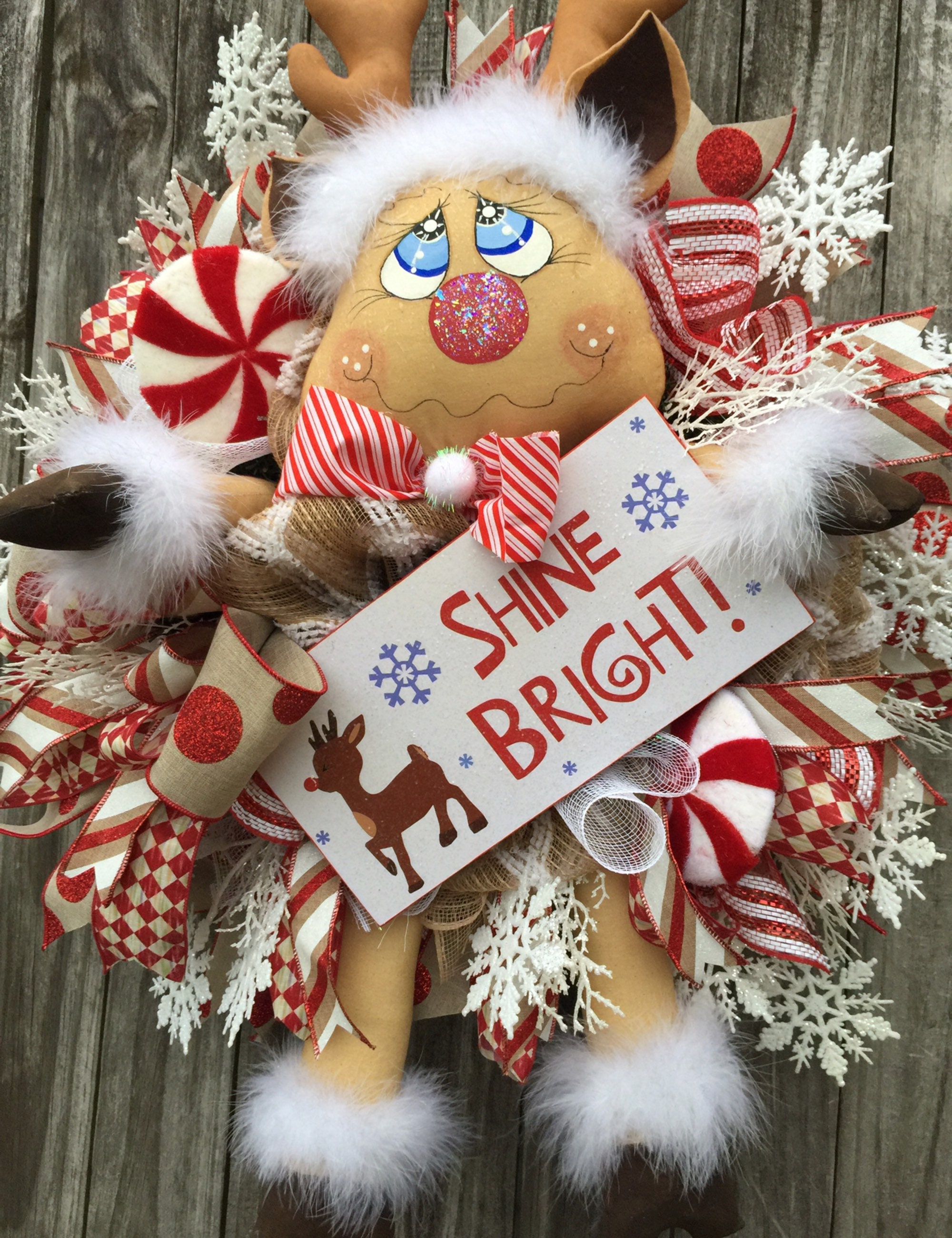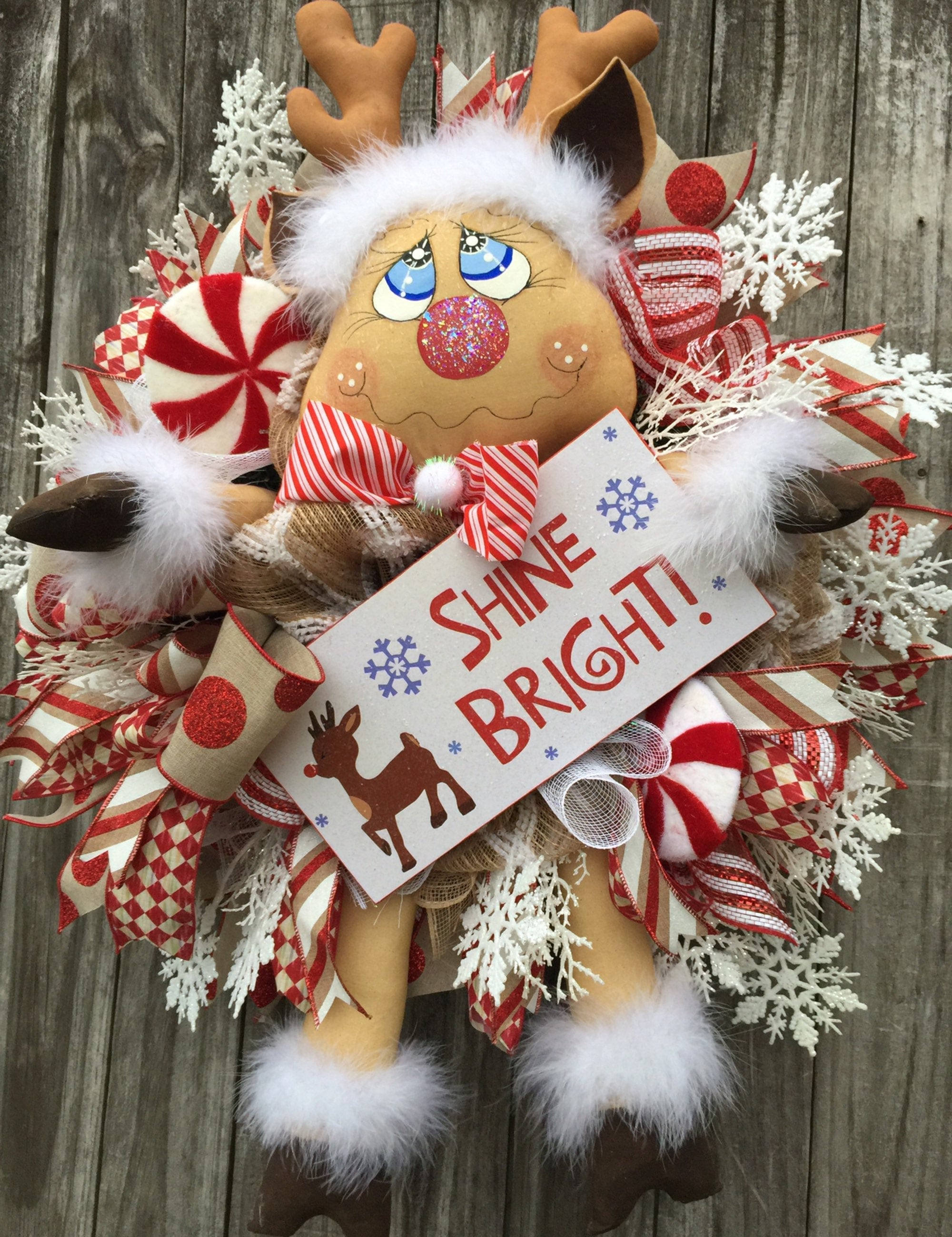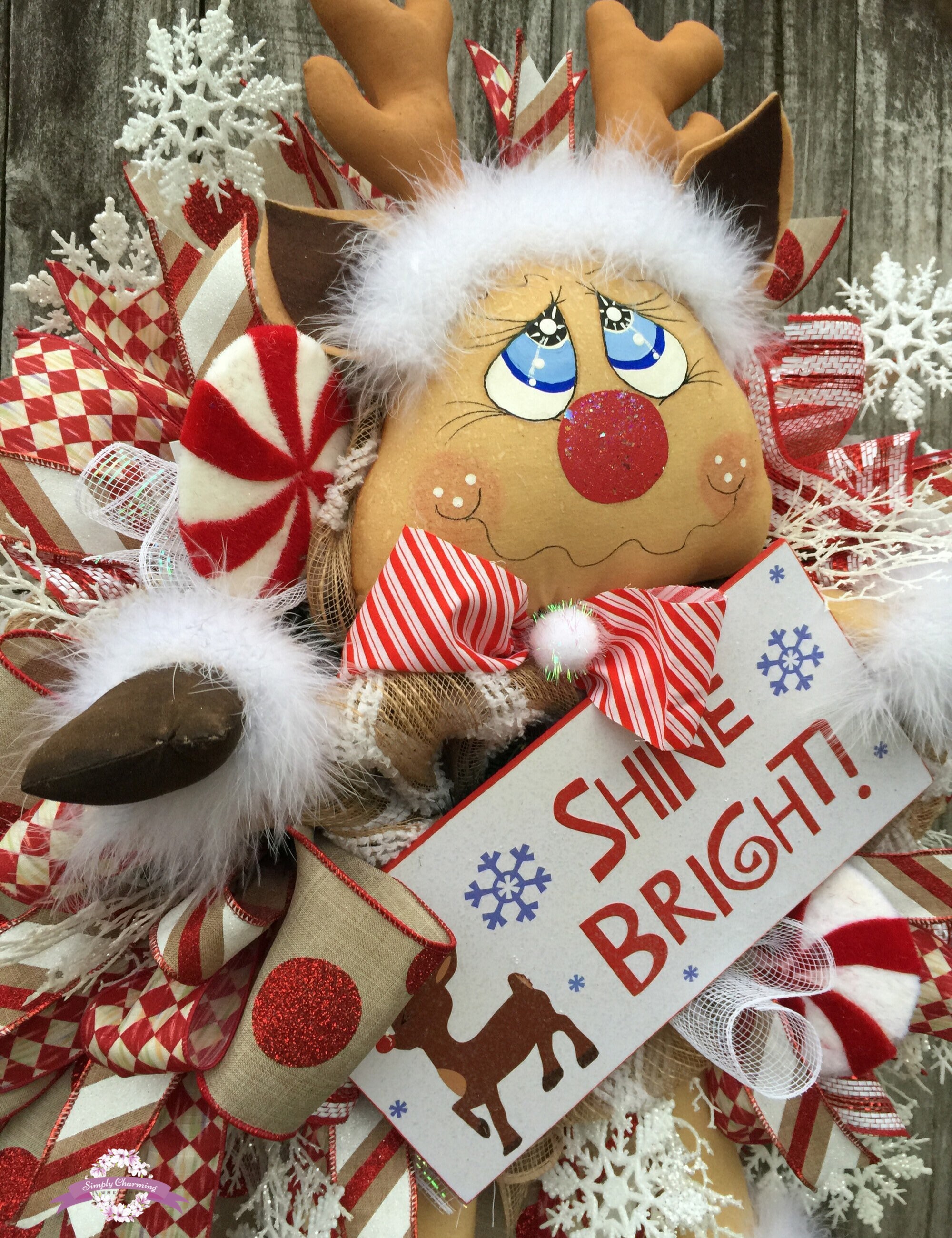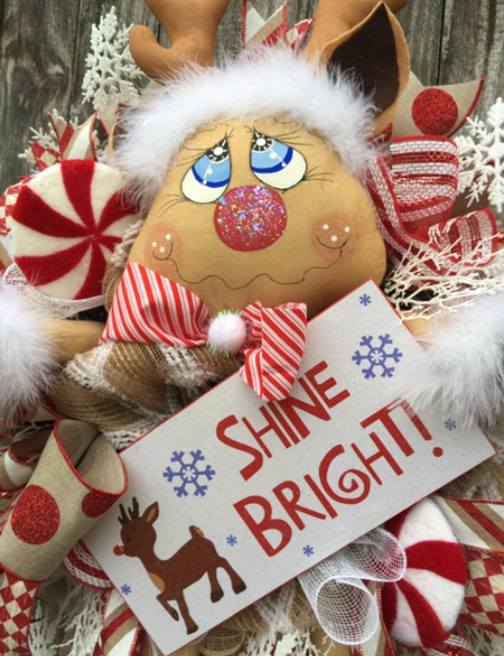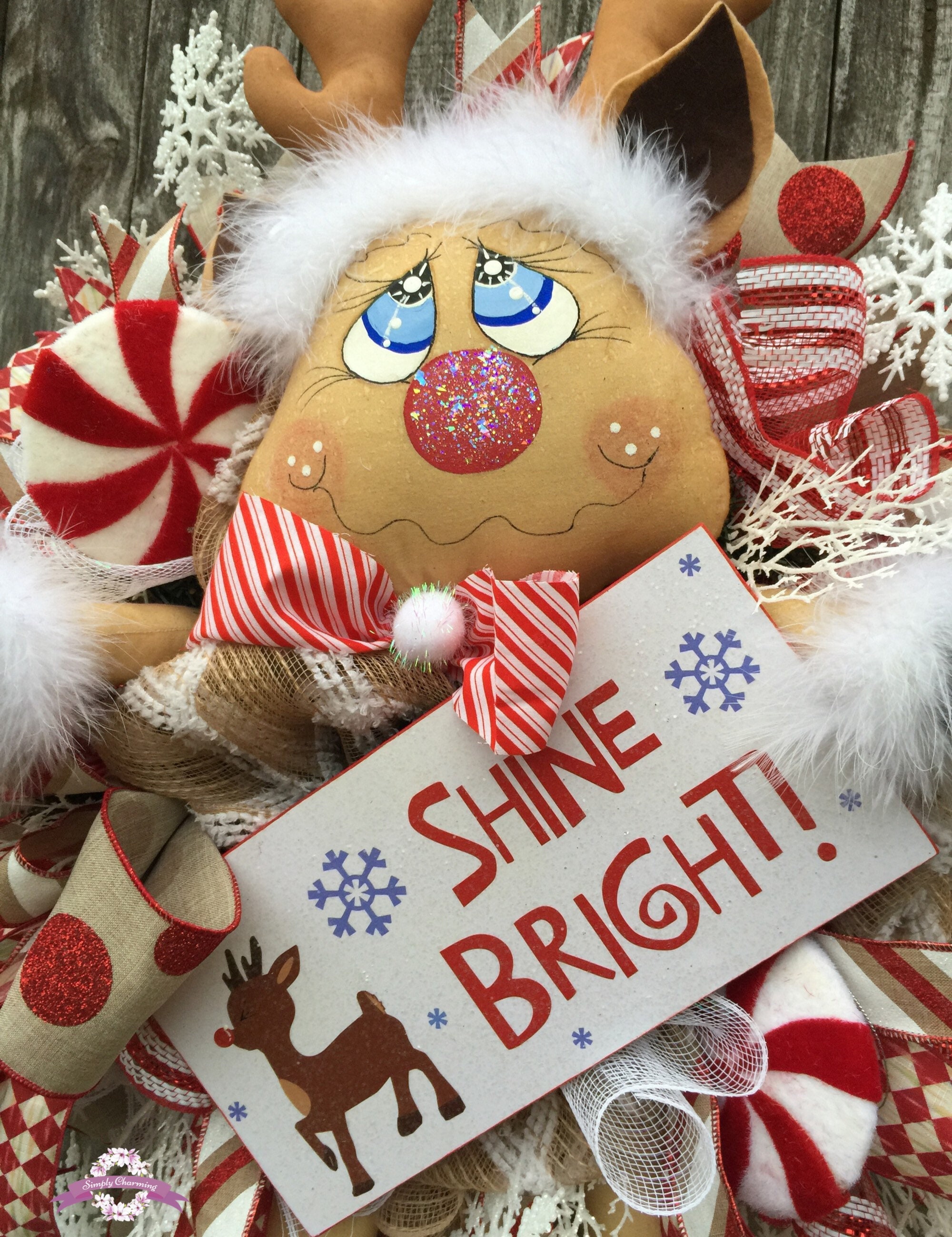 🎄DESCRIPTION: Designed on a evergreen pine base. Layered in mesh and accented with color coordinating ribbons and bows. Rudy the reindeer is surrounded by sweet peppermint candy and glittery snowflakes. A fun sign with a reindeer and snowflakes brings this fun filled Christmas wreath together.