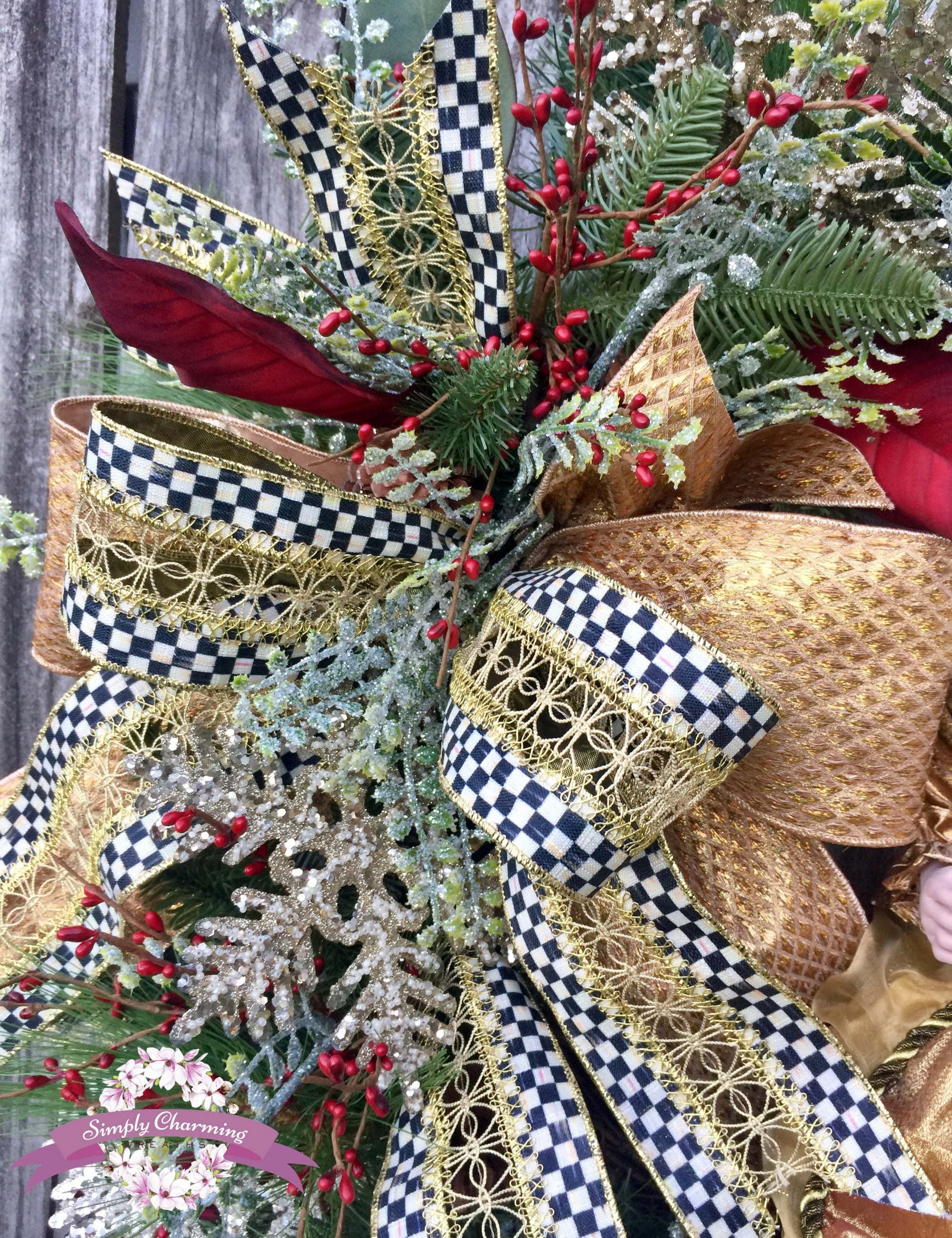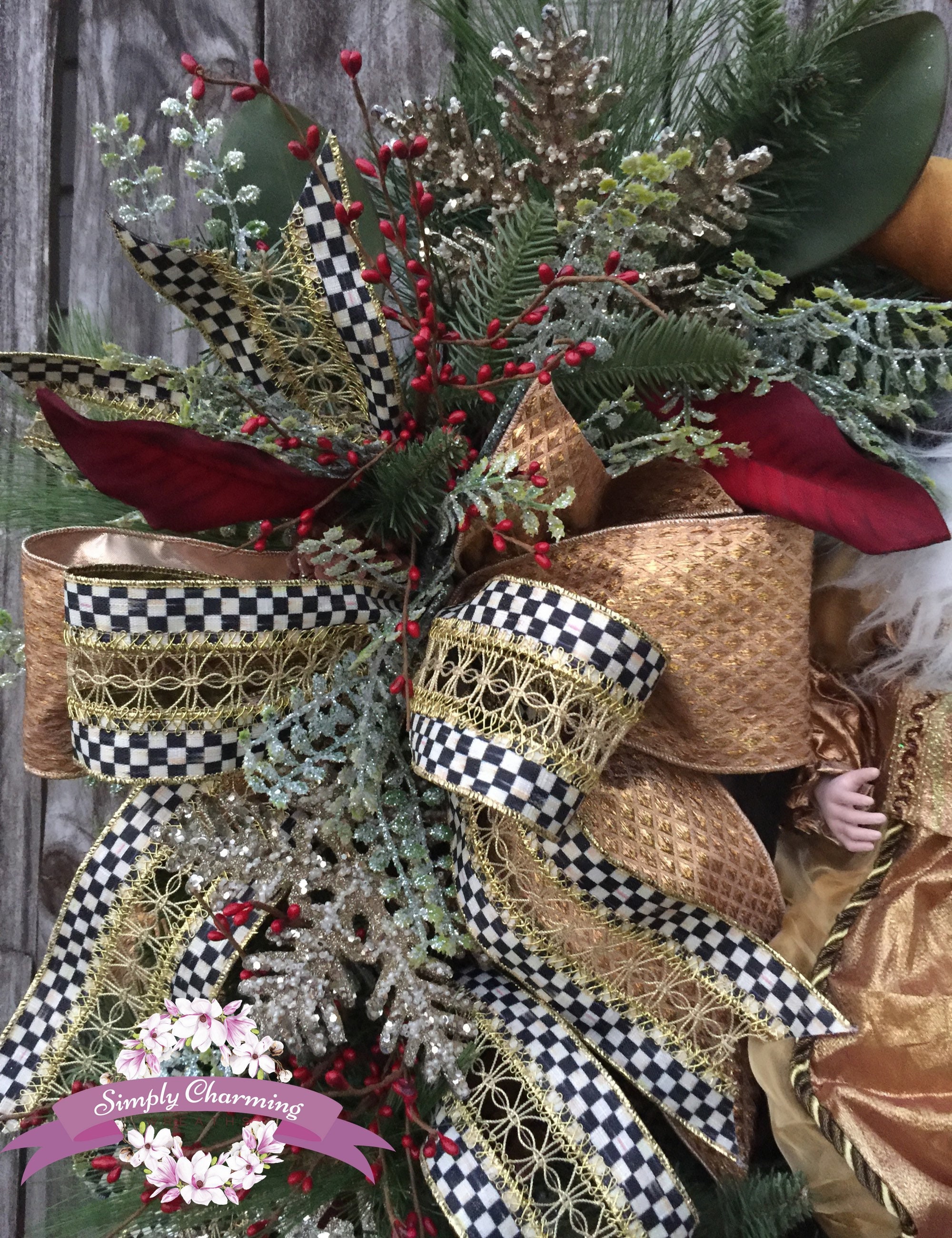 🎄DESCRIPTION: This gorgeous wreath is designed on a 18" grapevine base. Full of traditional Christmas Pine with Magnolia leaf greenery and accented with frosted mini leaf greenery. Embellished with glitzy gold snowflake ornaments and pretty red pip berry sprays. Accented with elegant designer 4" gold ribbon and #.5" gold with black and white Mackenzie Childs ribbon..... Absolutely breath taking ribbon! Mr. Santa is absolutely stunning and gives this big beauty a beautiful elegant Christmas appeal.
