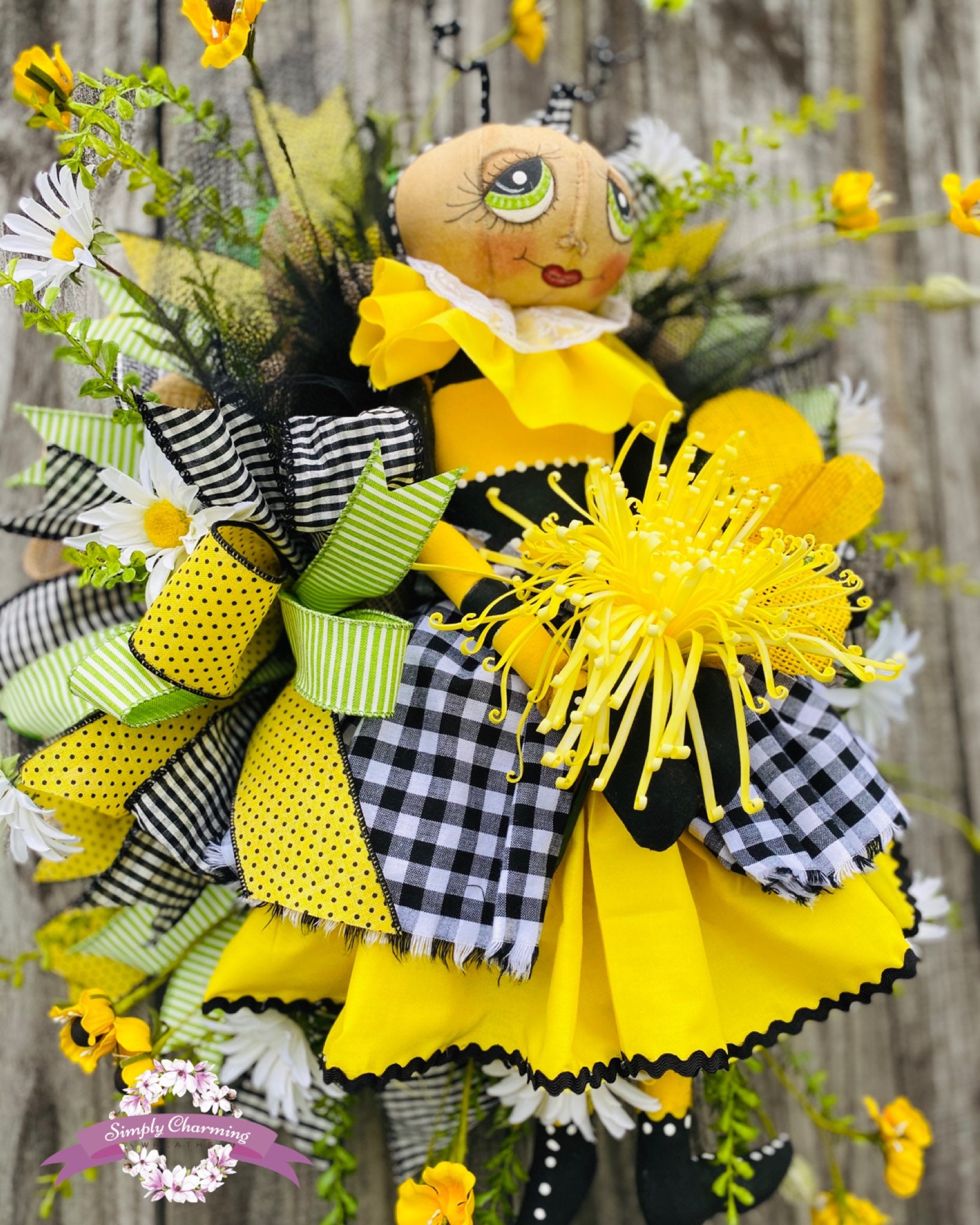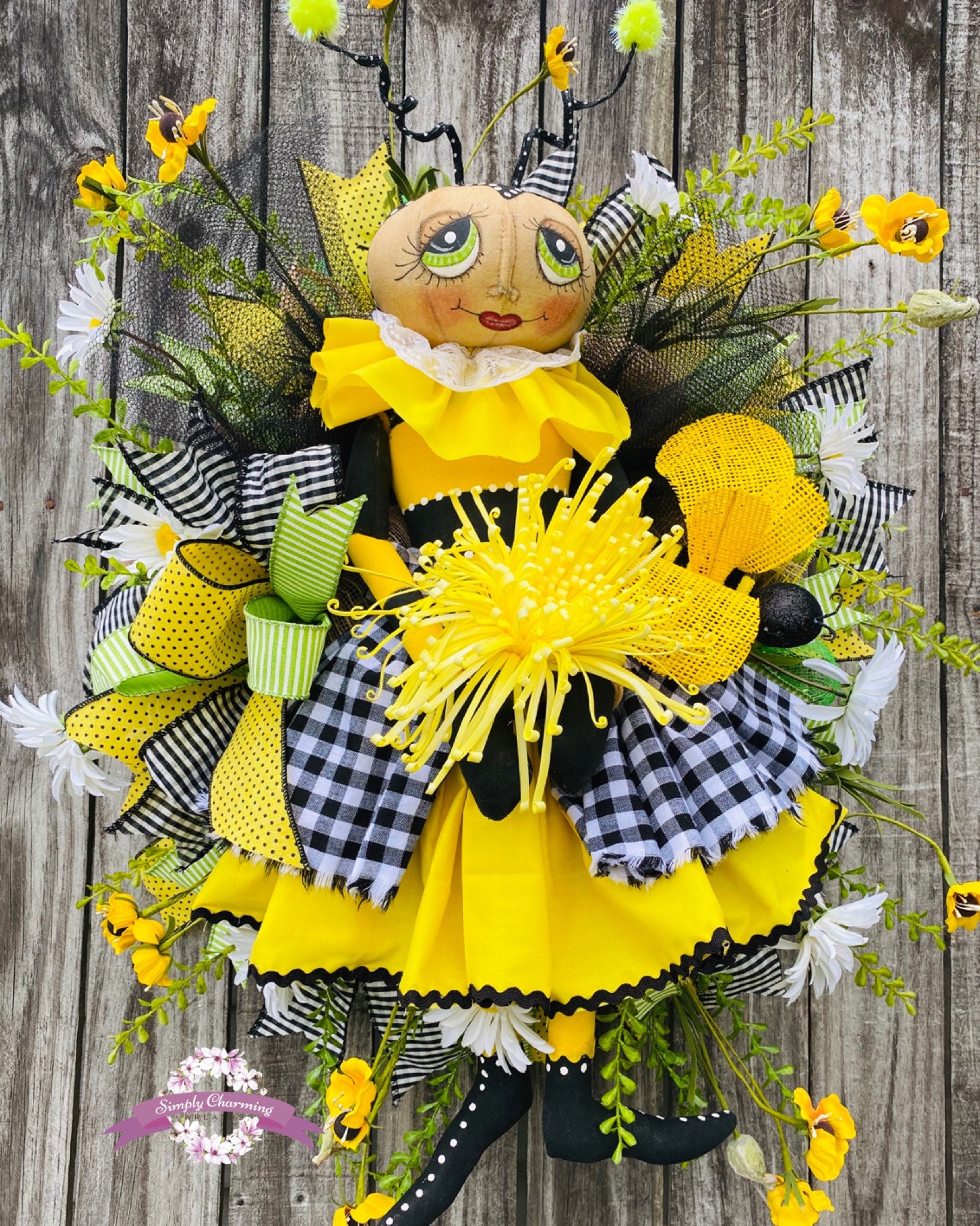 💐 A bumble bee wreath that will brighten up your front door and will make you smile! PERFECT for spring AND summer! This wreath was made on a evergreen base with layers of deco mesh in several colors. Beautiful color coordinating wired ribbon is surrounded by fun white daisies, yellow wispy florals and greenery. In the center a beautiful bumblebee 🐝 and she’s sure to bee the buzz!!! She’s holding a fun yellow flower and has a little bee visitor to keep her company.