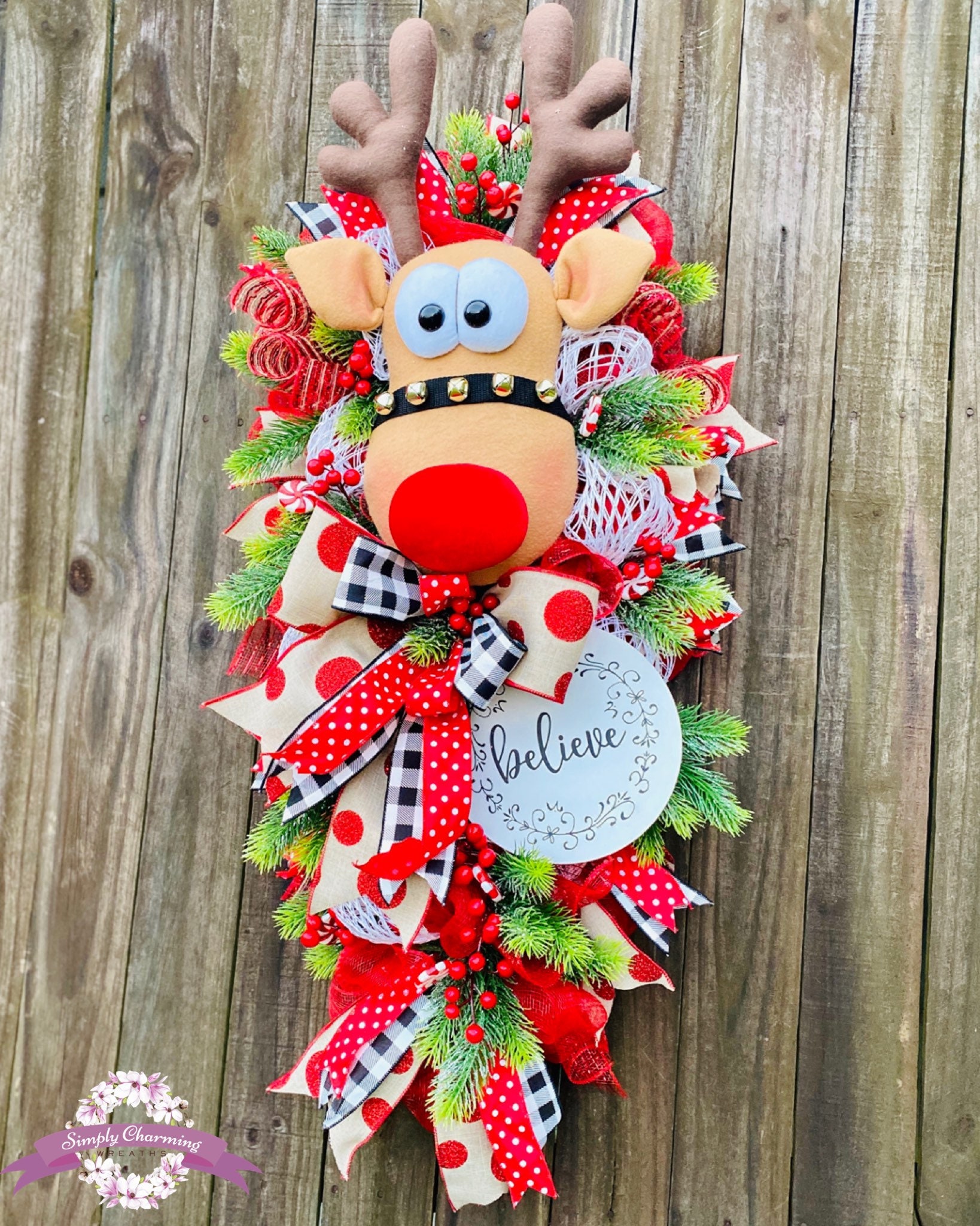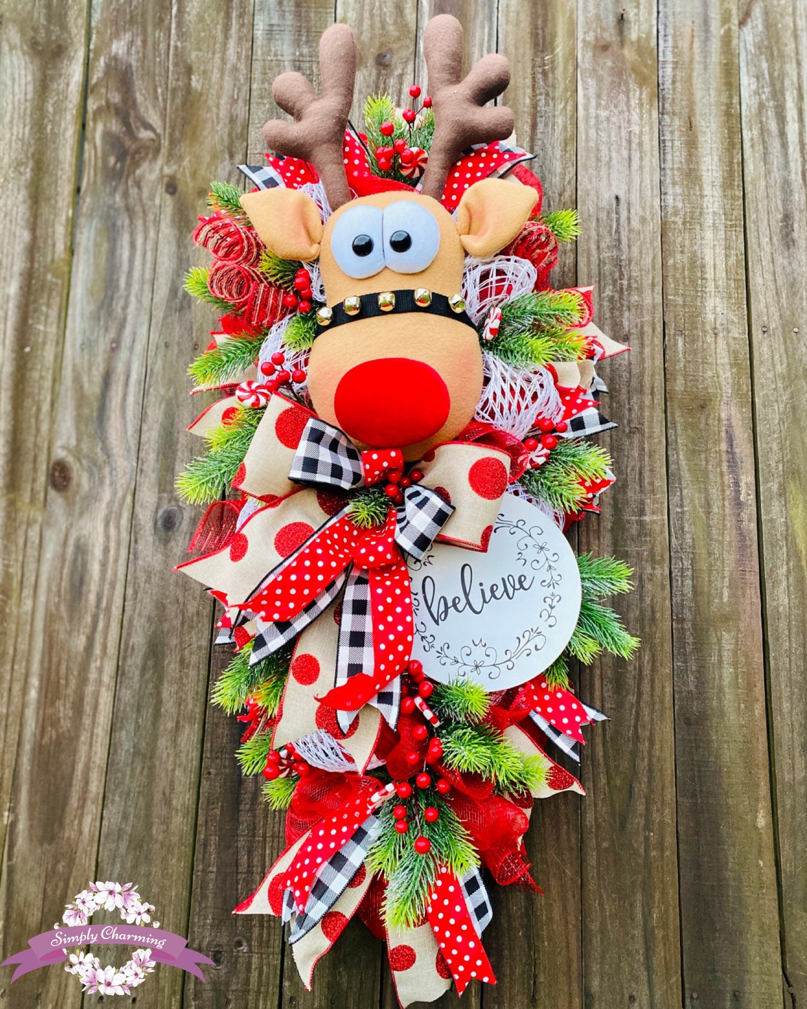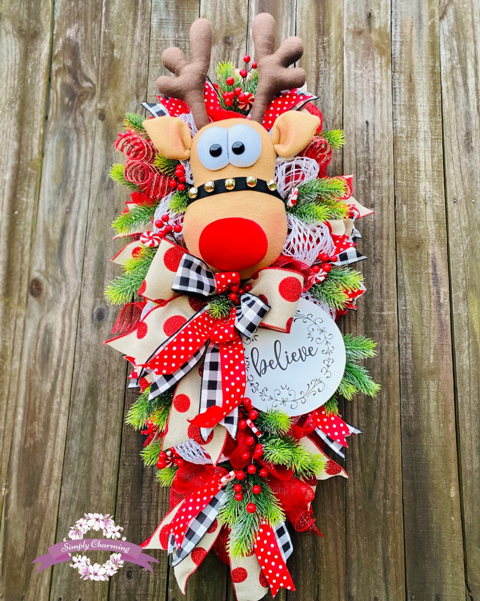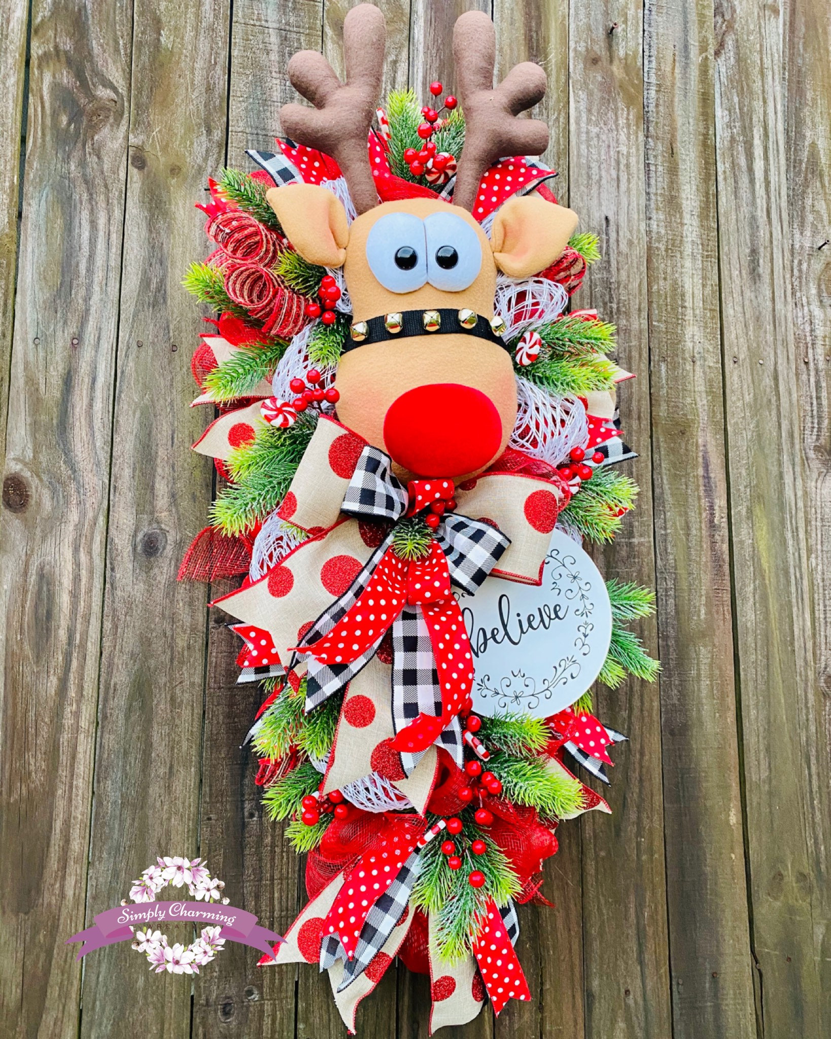 🎄DESCRIPTION: Designed on a red tear drop swag base. Layered in mesh and accented with color coordinating ribbons and bows. The sweetest reindeer is surrounded by glittery Christmas greenery, red berries and peppermints! A metal Noel sign and the cutest reindeer make this swag full of fun and Christmas cheer.