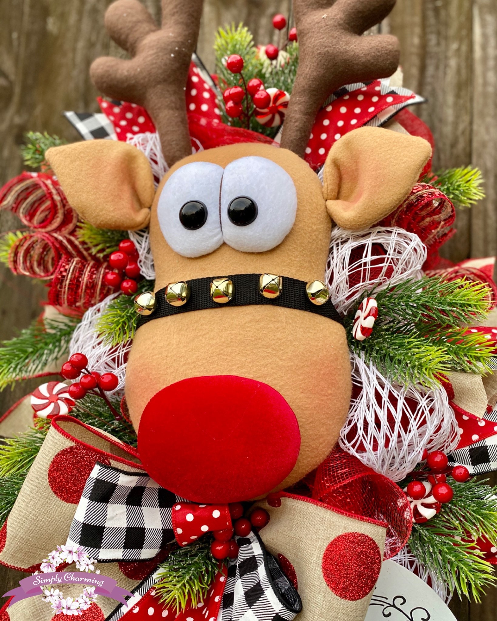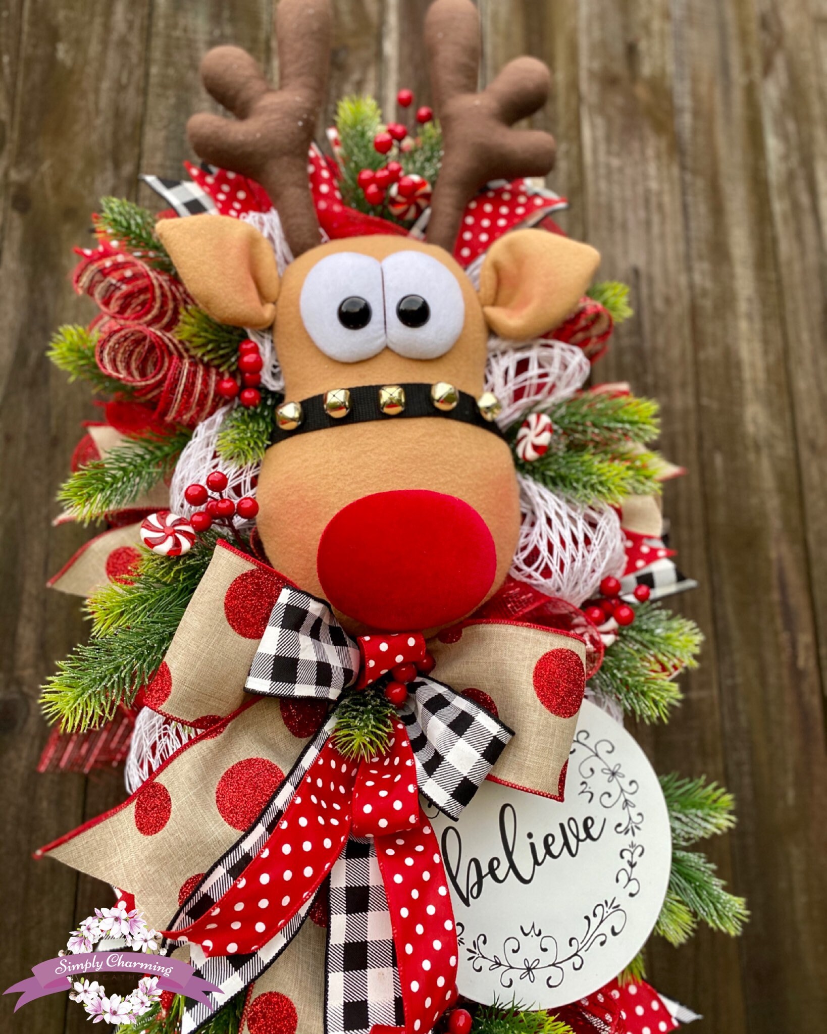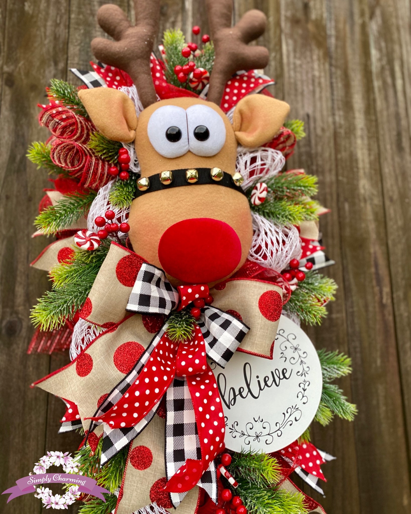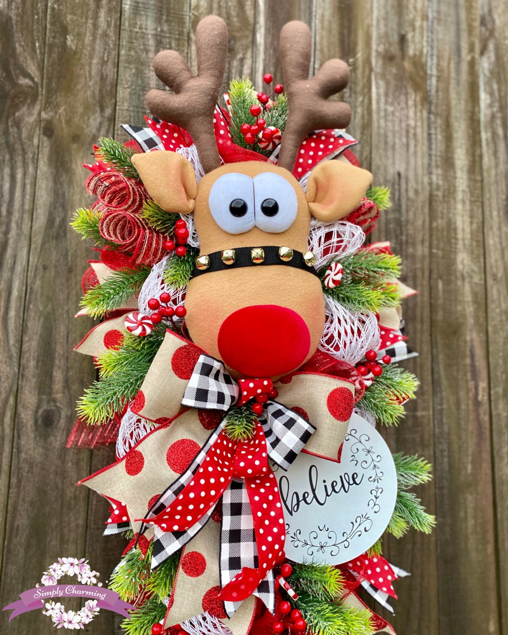 🎄DESCRIPTION: Designed on a red tear drop swag base. Layered in mesh and accented with color coordinating ribbons and bows. The sweetest reindeer is surrounded by glittery Christmas greenery, red berries and peppermints! A metal Noel sign and the cutest reindeer make this swag full of fun and Christmas cheer.