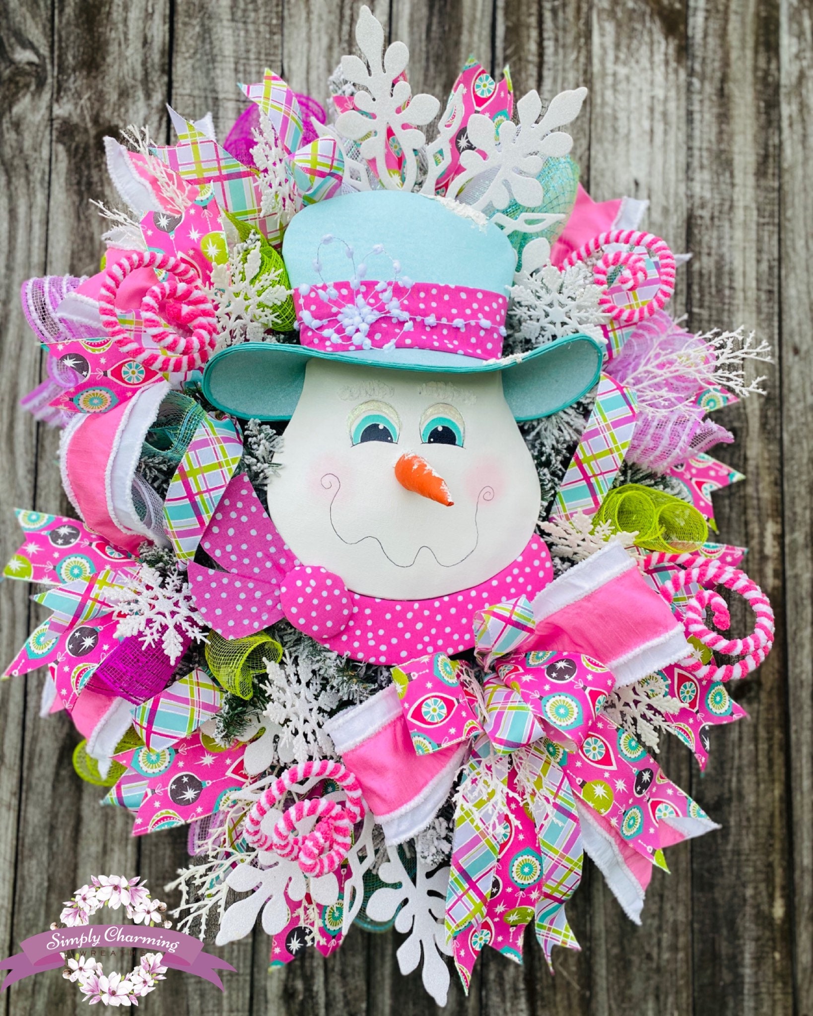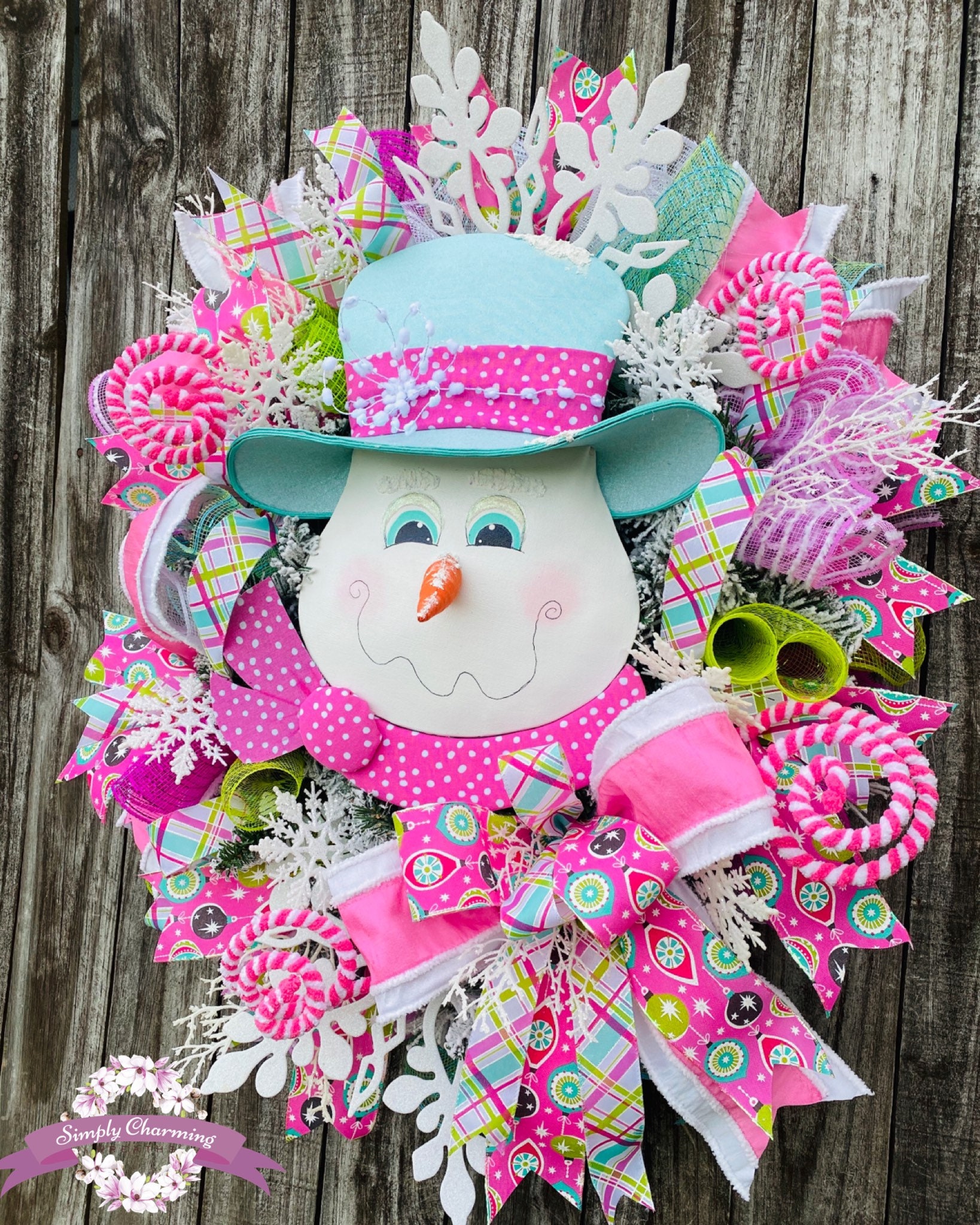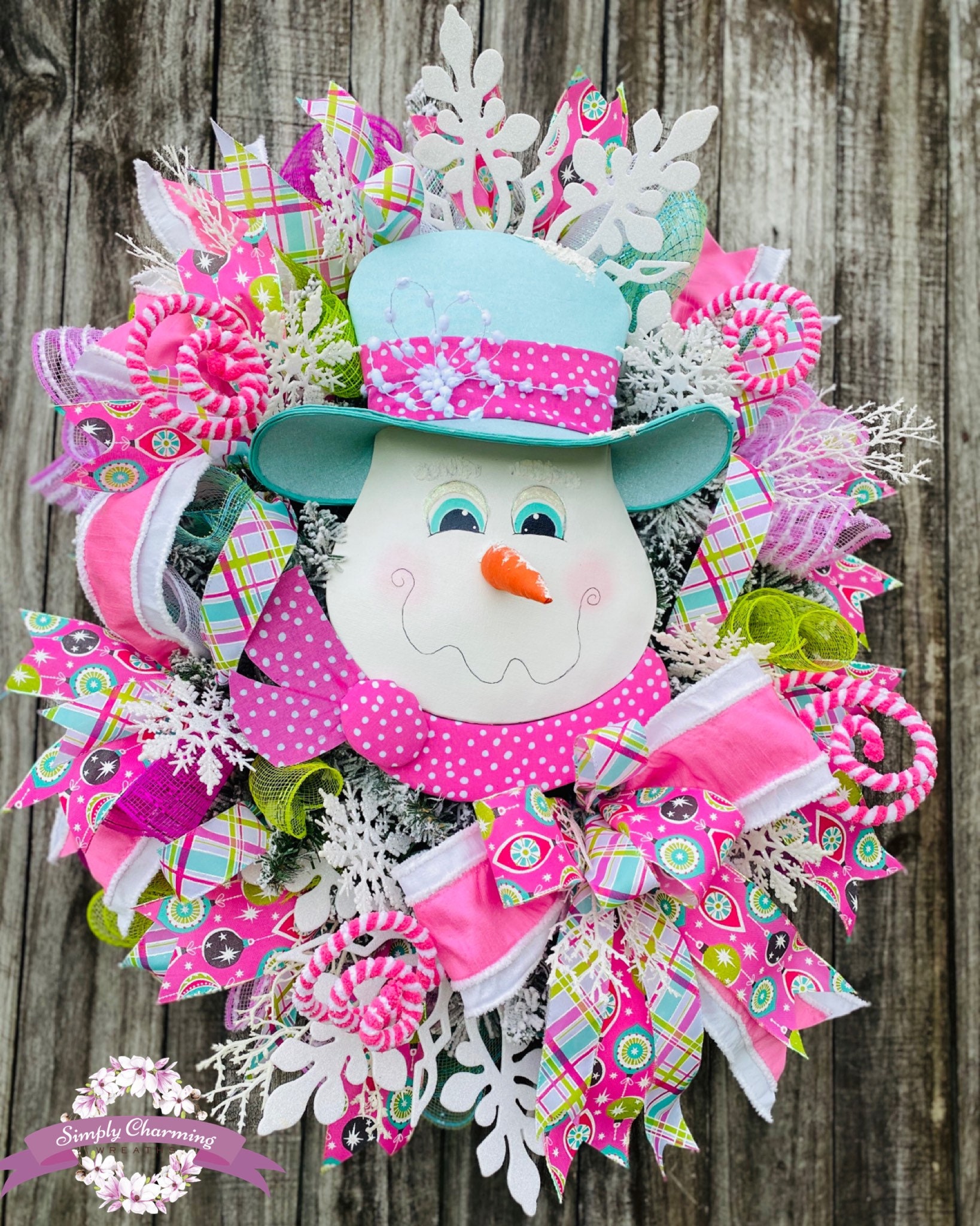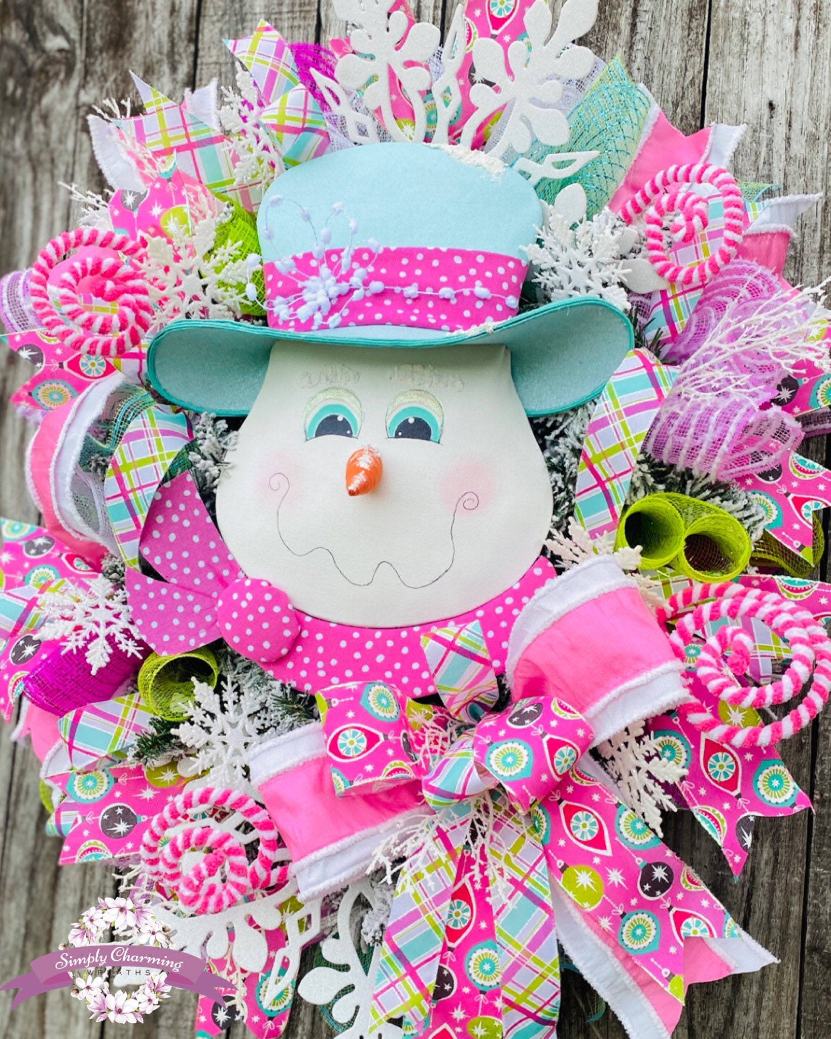 🎄DESCRIPTION: Full of deco mesh with a variety of wired ribbons matching all the vibrant colors to the adorable snowman. This sweet snowman is surrounded by snowflakes and gorgeous ribbons. Get ready for the Christmas season and add magical delight to your holiday decor!!!